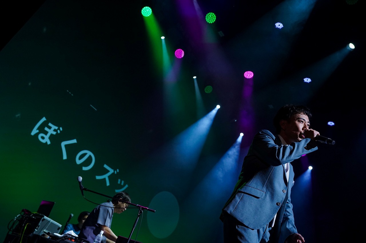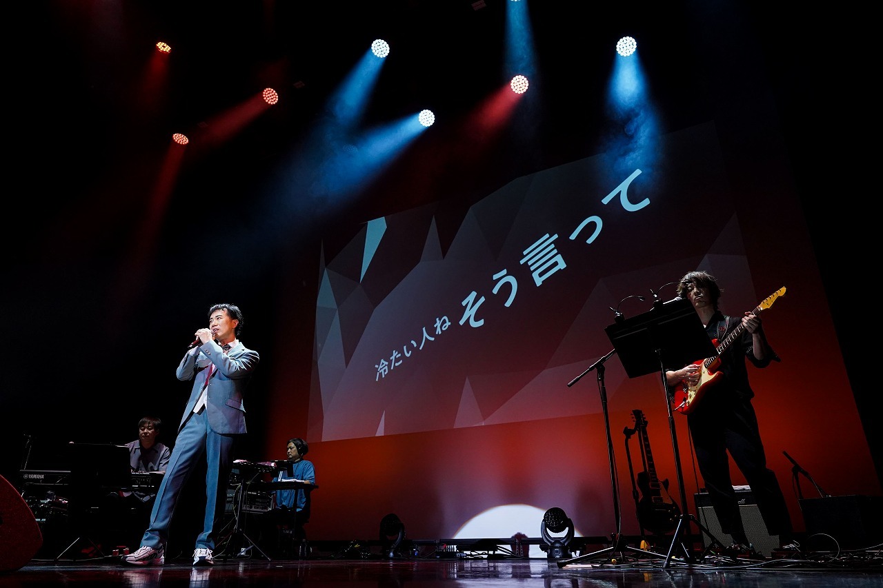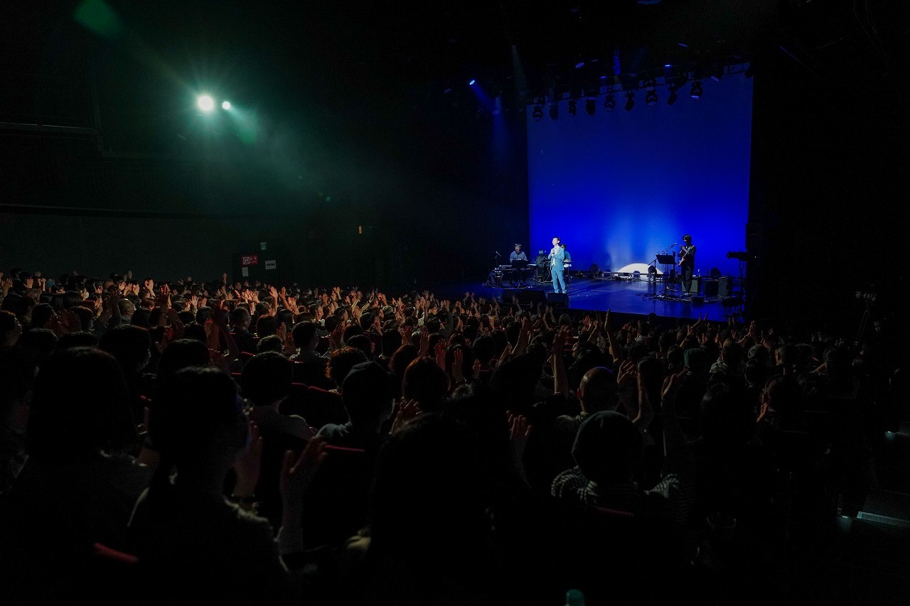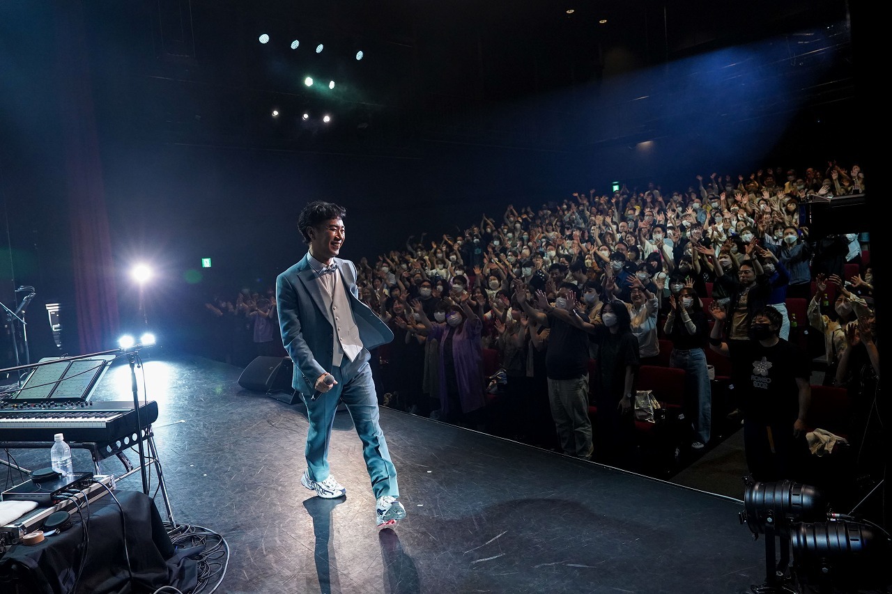 今回会場になったI'M A SHOWは、昨年末オープンした新劇場。映画館をリニューアルした劇場だけに、どの席からもステージの息遣いを感じ取ることのできる親密な空間だ。1stライブのツアーグッズを手にした根強いファンがちらほら目に入りながらも、昨今の藤井の多彩な音楽活動の影響もあってか幅広い年代のオーディエンスを迎え、満員御礼でライブが開演。「絶望グッドバイ」のイントロを出囃子にミントグリーンのタキシードに身を包んだ藤井がステージに登場すると「一緒に盛り上がってくださいますか? 最後までよろしくお願いします!」とコール&レスポンスを交えながら挨拶。拍手と歓声が止まぬうちにアルバムの1曲目にもあたる「未確認飛行体」でライブがスタートした。都会的なモチーフが散りばめられた歌詞と小気味よいギターカッティングは、まさにシティポップらしいサウンドだ。なにより“シティポップ”というジャンルが再定義されていなかった2002年に生まれたこのアルバムが、約21年の時を超えて受け入れられ、幅広い年代のオーディエンスに直接響いている光景を目にすると感慨深い気持ちにさせられる。