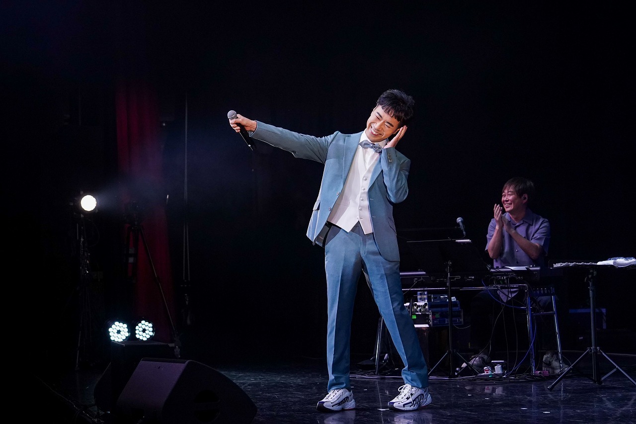『ロミオ道行』は、2002年に松本隆プロデュース&全曲作詞でリリースされた藤井隆の1stアルバム。今回のイベントは『ロミオ道行』リリースのタイミングで行われた1stライブツアーの再演というから、約21年ぶりのアルバム全曲披露である。よく考えていただきたいのだが、2002年といえばサッカー日韓ワールドカップの開催年である。あれから5回ものワールドカップを経た今日でも時の洗礼を乗り越え、聴き継がれる『ロミオ道行』。そんな伝説的な名盤のライブ再演となればファンならずとも垂涎ものである。