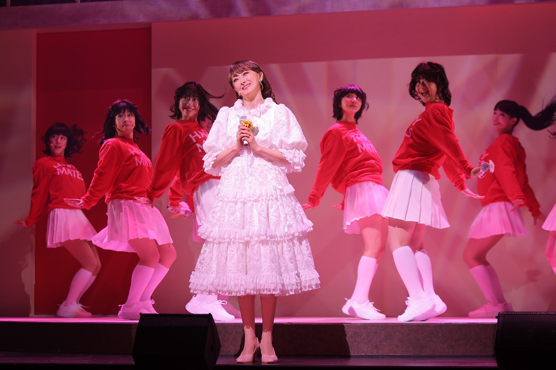 「現在」と彼女たちの青春時代である「1980年代」との交錯がテンポよく描かれていく。その舞台を彩るのは、あみんの「待つわ」やチェッカーズの「涙のリクエスト」、中森明菜の「飾りじゃないのよ涙は」等々、今も愛され続けている70~80年代の大ヒット曲。それらヒット曲が物語上に巧みに配置され、観ていて登場人物たちの心情にリンクしやすいところに、1975年生まれの演出家の腕の冴えを感じた。また、登場人物たちの現在と高校時代を二人一役で演じる趣向になっている。ロングスカートで息巻くスケバンたちに扮した渡邉美穂や須藤茉麻ら、若い世代のキャストがエネルギーを爆発させるのを、現在軸を演じる年上世代のキャストが温かく見守る様が、世代を超えた女性たちの共鳴をも感じさせるところがある。過去の自分と再会することで、今の自分と向き合い、未来の自分へと歩いていく。自分も他者も含めた不器用な生を丸ごと肯定して前向きに進んでいこうと思える、パワーを大いにもらえる舞台となっている。