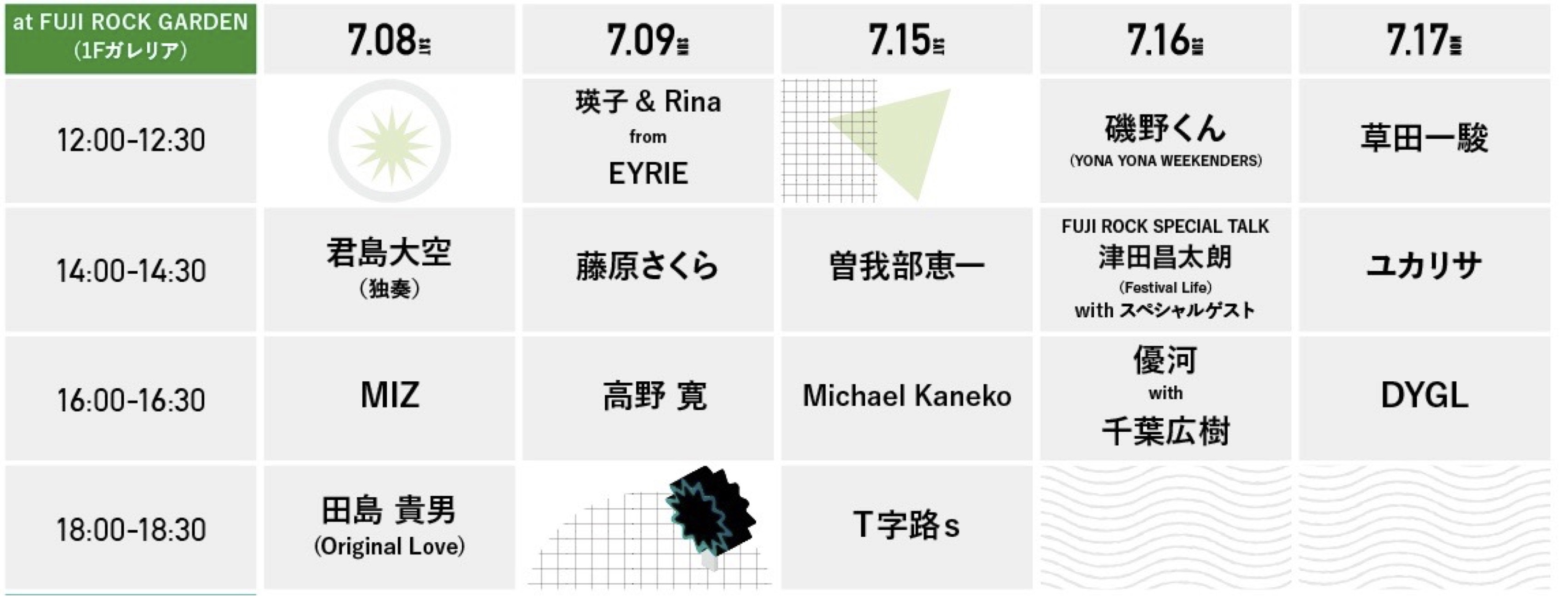イベント期間中の土日祝(7月8日(土)、9日(日)、15日(土)、16日(日) 、17日(月・祝))の5日間、田島 貴男 (Original Love)、君島大空、曽我部恵一など『フジロック』にゆかりの深い全14組のアーティストによるアコースティックライブを開催。さらに、津田昌太朗氏とスペシャルゲストによるスペシャルトークショーも行われる。