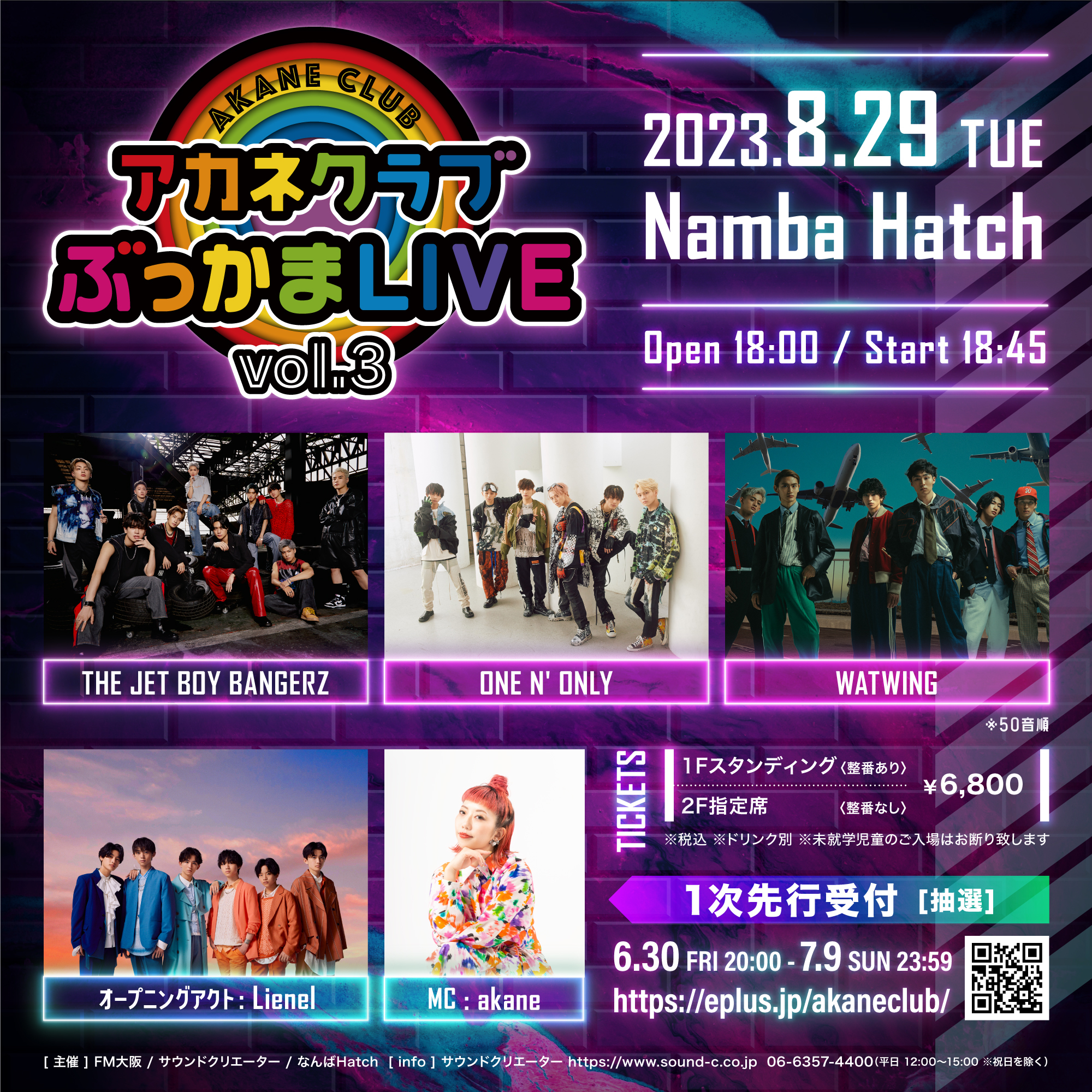 2023年8月29日(木)大阪・なんばHatchにて、『アカネクラブぶっかまLIVE vol.3』の開催が決定。THE JET BOY BANGERZ、ONE N' ONLY、WATWINGと、オープニングアクトにLienelの出演が決定した。