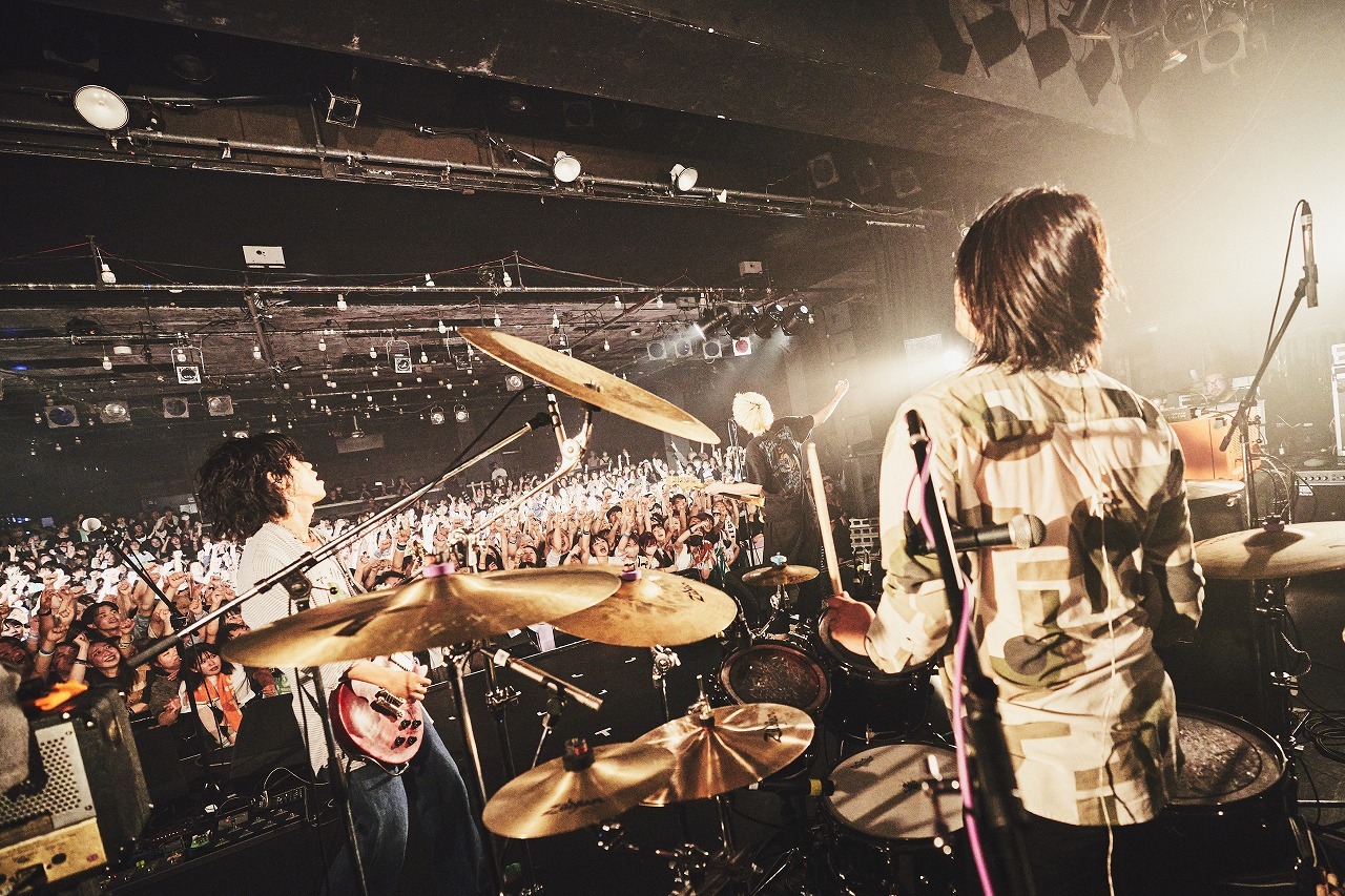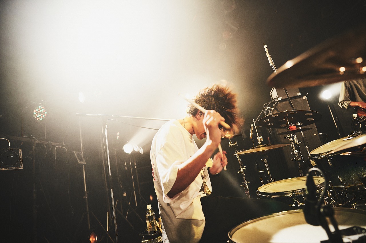 そしてイベントのトリを務めるThis is LASTの出番だ。SEが鳴り出した瞬間の拍手と歓声が、今彼らに注がれる熱視線の証。その熱を受け止めるように菊池陽報(Vo/Gt)は「よろしくね」と短く挨拶し、いきなり「もういいの?」を投下する。小気味いいリズムとギターリフに手拍子で応えるオーディエンス。フロアからの合いの手もバッチリ決まった「恋愛凡人は踊らない」を経てさらにポップな「カスミソウ」に突入する頃には、リキッドルームは完全に彼らの土俵になっていた。最後はドラムの鹿又輝直のもとに集まってキメると、ここでリリースされたばかりの新曲「おやすみ」が披露される。突き抜けるようなギターのサウンドが強烈に耳に残るイントロから歌に入った瞬間にバンドの背中を押すような手拍子がリキッドルームを包み込む。ぐいぐいと前進するバンドサウンドのパワー、そしてそれをさらに引っ張る陽報の歌。This is LASTというバンドの今の強靭な「等身大」が、この曲には詰まっていると思う。