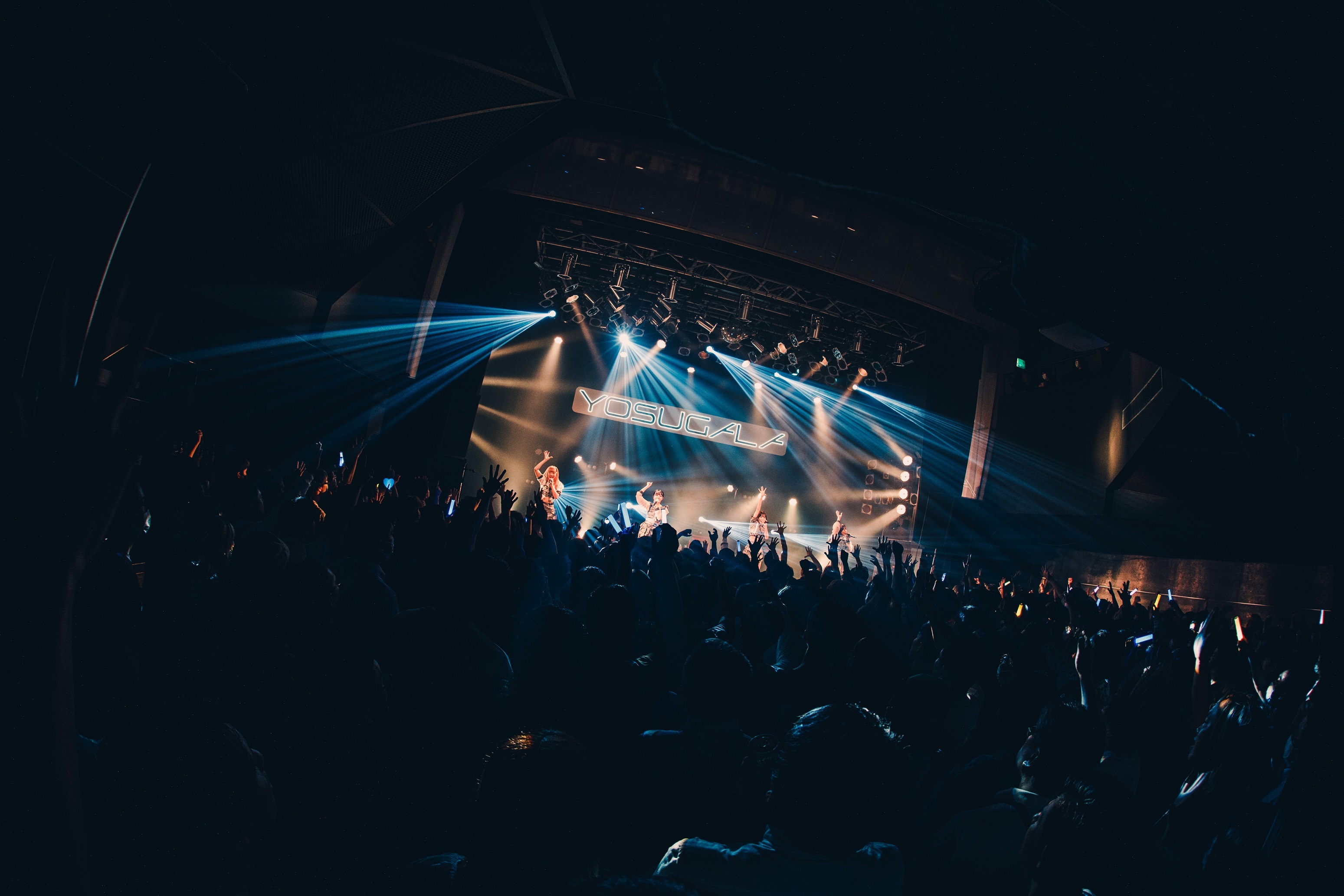 ライブはオンタイムで始まった。場内が暗転し、SEが鳴り始める。そして、<YOSUGALA>の電飾に1文字ずつ青い光が灯ると、パンパンのフロアから驚き混じり歓声があがる。