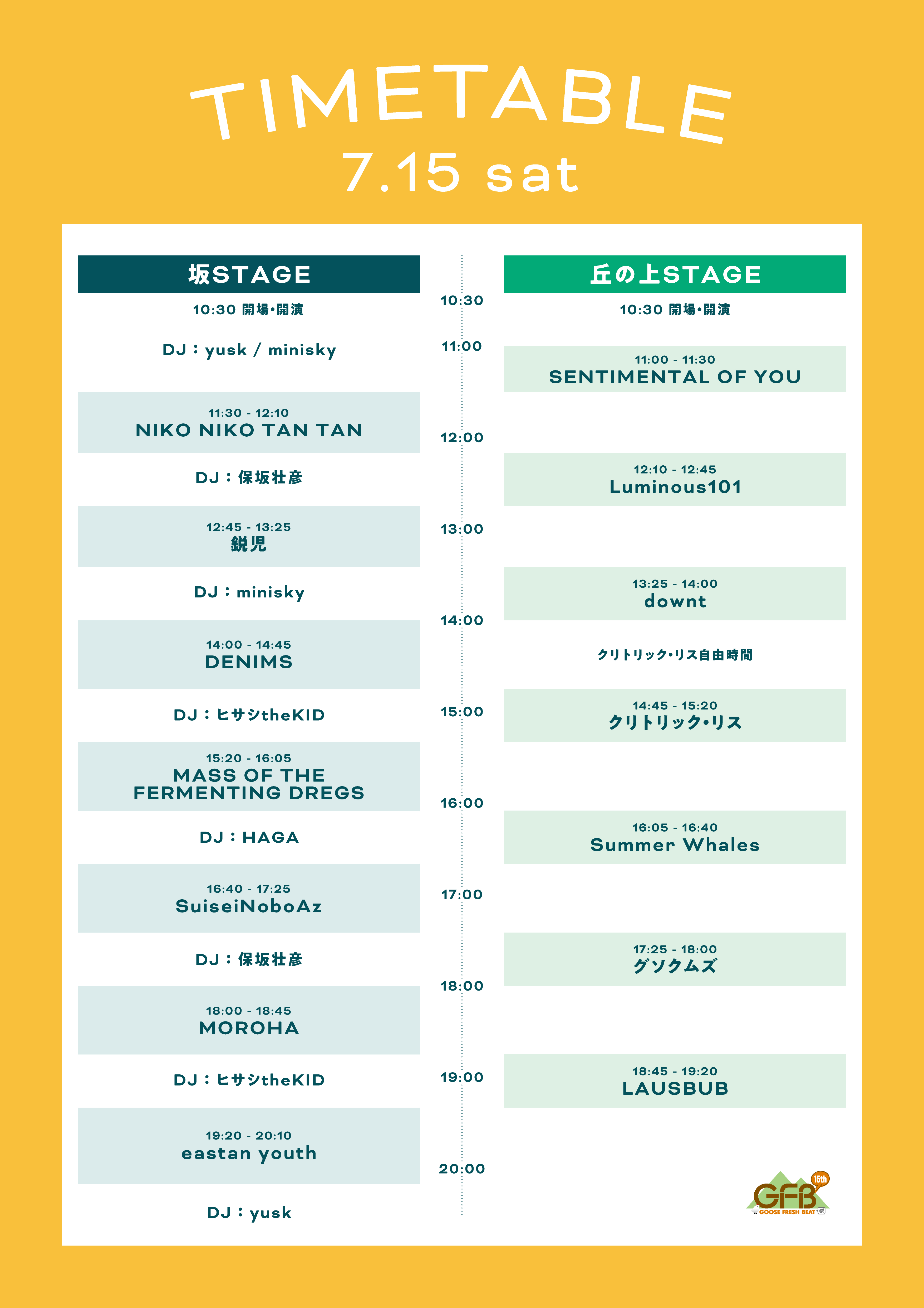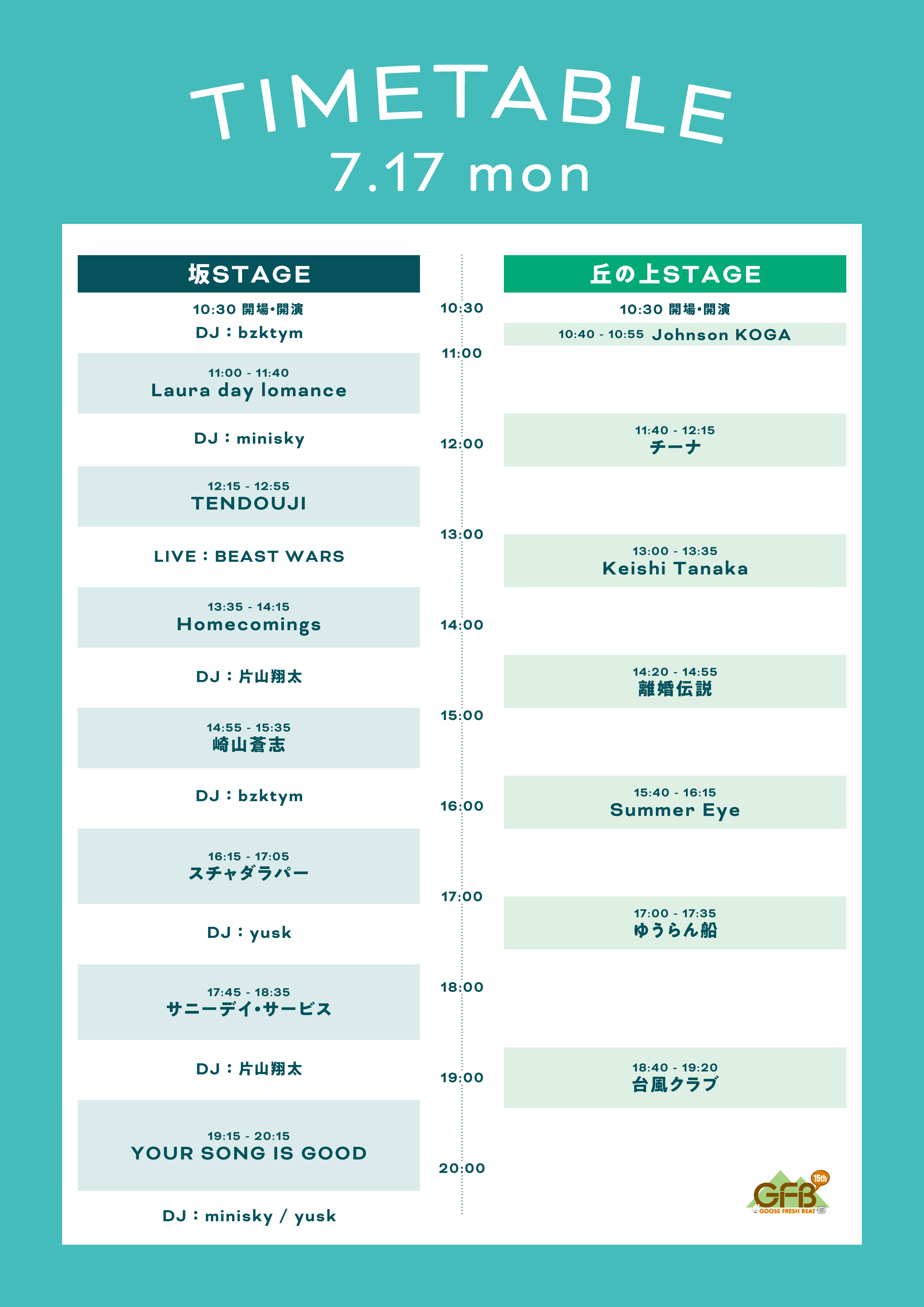 『GFB』は、今年で開催から15年目を迎えた野外フェス。今回の発表で、7月15日(土)はeastern youthが、7月16日(日)はドミコが、7月17日(月・祝)はYOUR SONG IS GOODが、各日のトリを飾ることが決まっている。