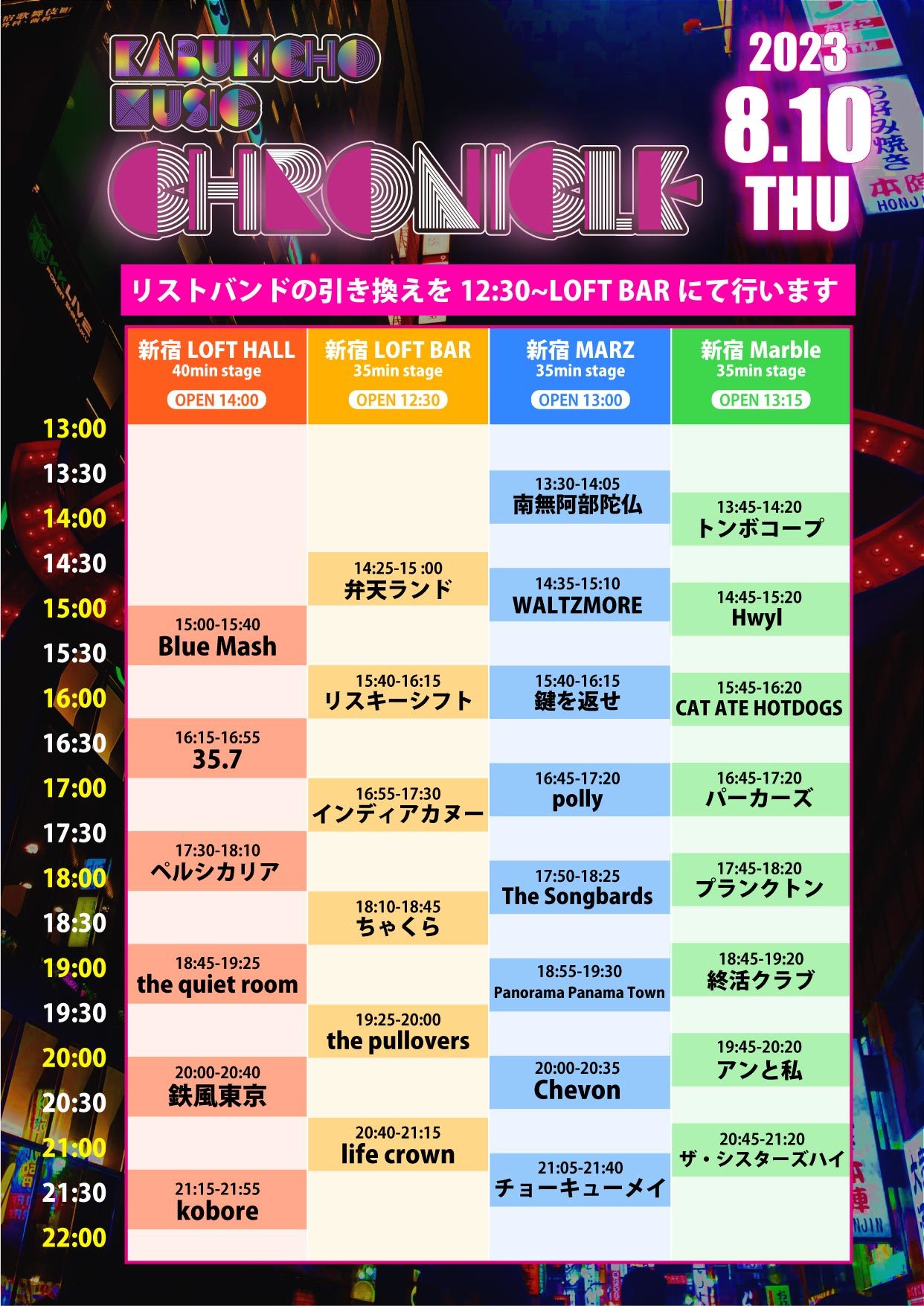 『歌舞伎町 MUSIC CHRONICLE 2023』は、新宿LOFTが主催するあらたなサーキットイベント。祝前日に開催される同イベントでは、新宿LOFT HALL・新宿 LOFT BAR・新宿MARZ・新宿Marbleの4会場が往来可能になっている。