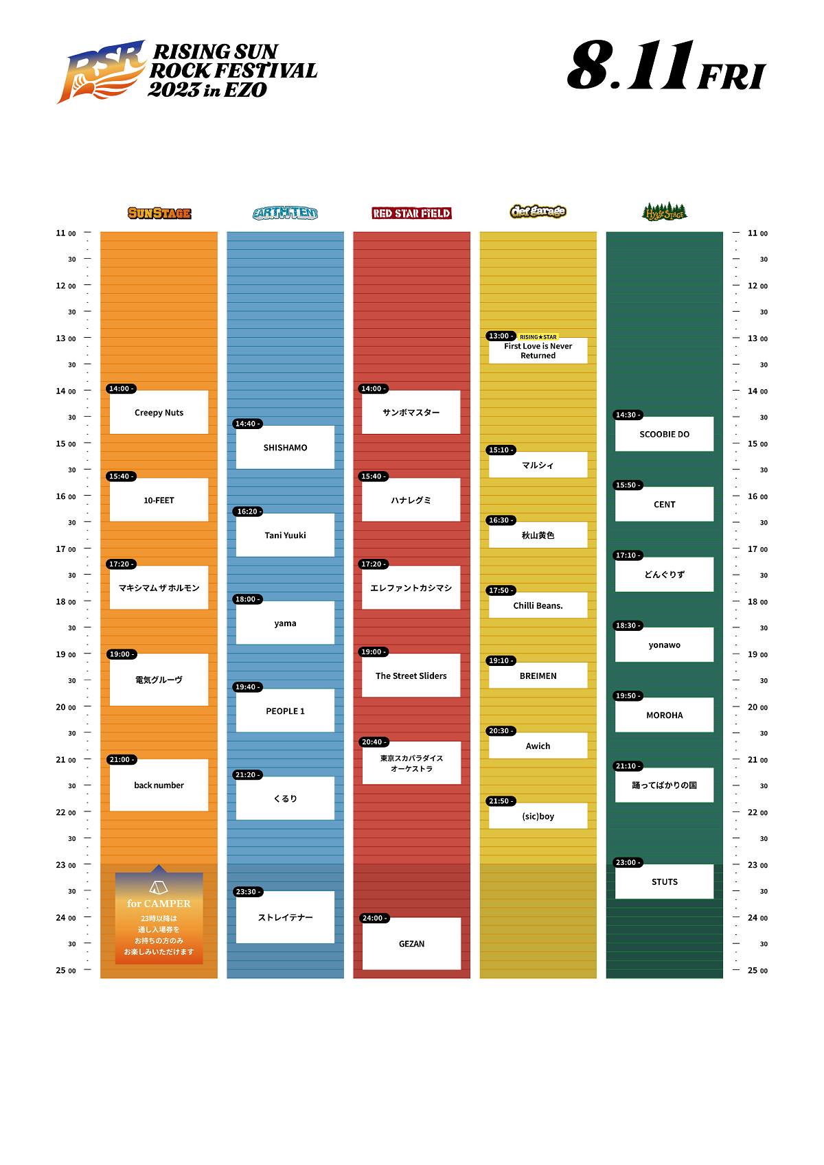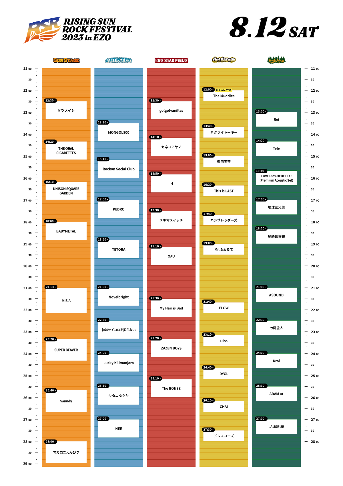 8月11日(金・祝)、8月12日(土)に北海道で開催されるオールナイト野外ロックフェス『RISING SUN ROCK FESTIVAL 2023 in EZO』(以下、RSR)の、出演ステージとタイムテーブルが発表された。