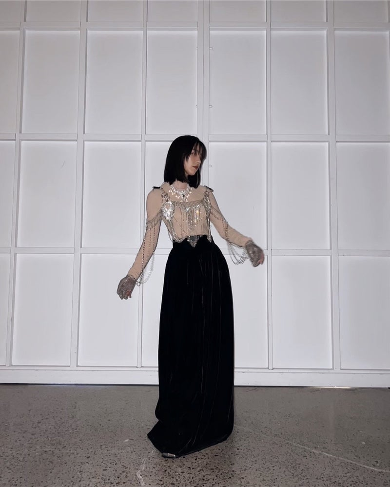 続けて、『PURSUE』のジャケット撮影衣装でポージングをとるオフショットを公開。「アーマーなディティールのドレス。心の中で追求する者には強い意志を示せる洋服が必要だった」と、ビジュアルについて説明。「ライブリハ終えたんだけど最高です」と、ライブに向けた近況を明かしている。