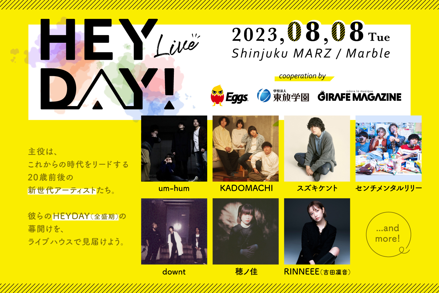 同イベントの主役は、これからの時代をリードする20歳前後の新世代アーティストたちで、大人への過渡期にしか持ち得ないエネルギーや感情や葛藤を、音楽に昇華してステージでぶつけ合うライブサーキットとなっている。彼らの「HEYDAY(全盛期)」の幕開けを、ぜひライブハウスで見届けよう。