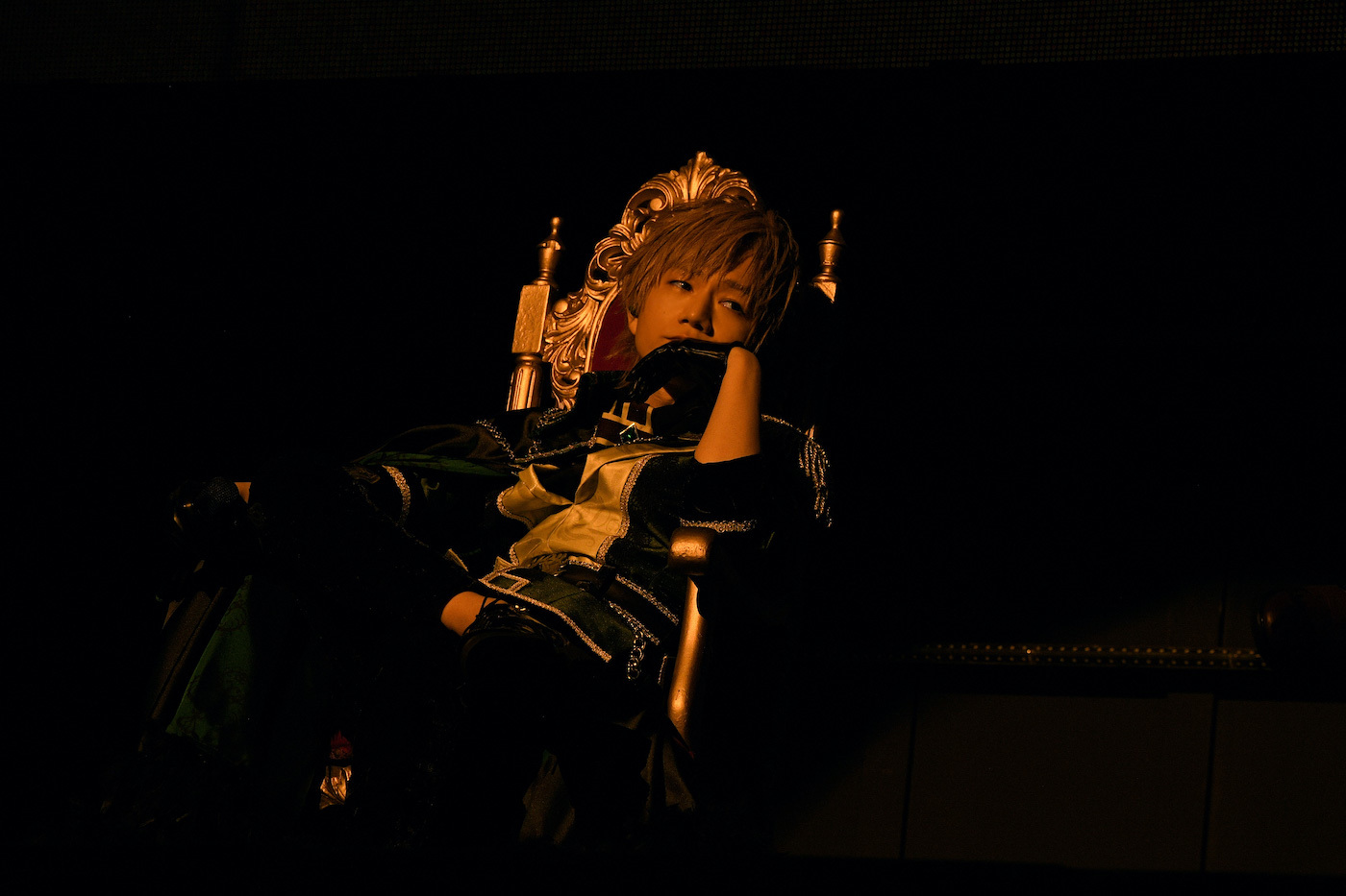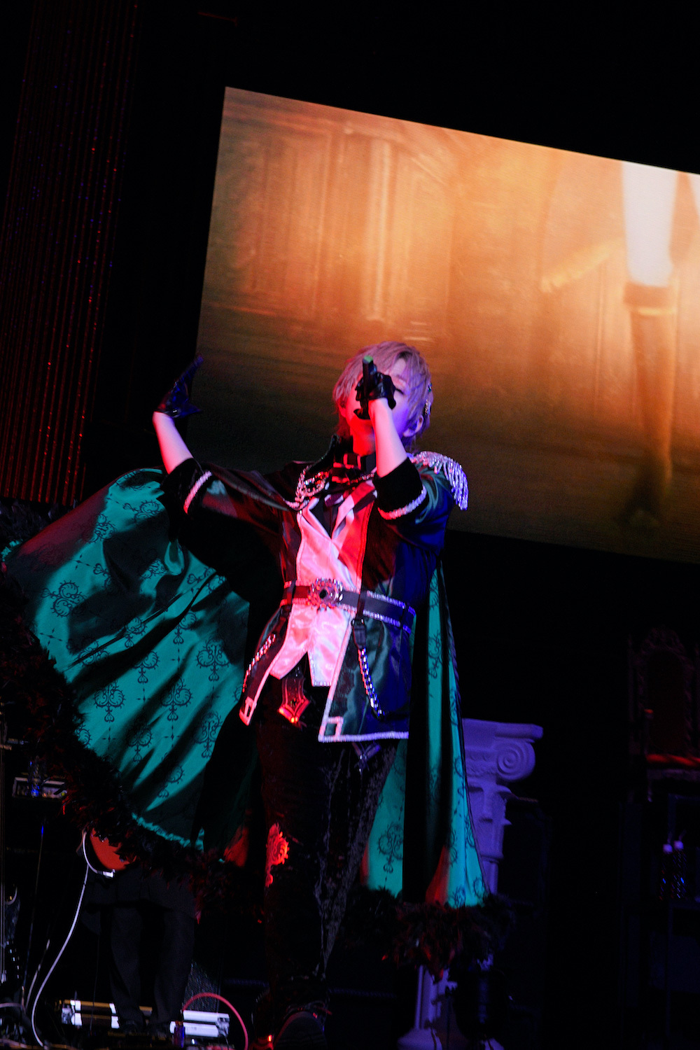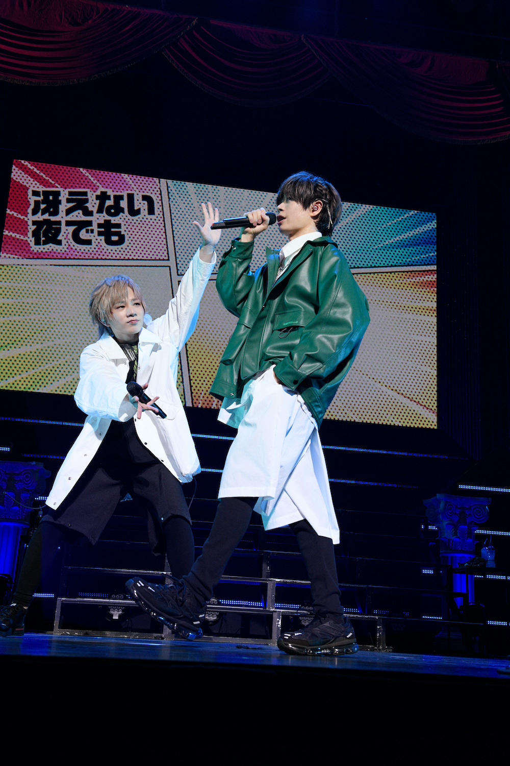 深紅のドレープ幕で飾られ、シャンデリアが下がり、ギリシャ様式の柱が置かれた荘厳なステージ。ダークファンタジー全開なオープニングムービーに続いてステージ上段にスポットライトが当たると、そこにはキービジュアルを思わせるマントをまとい玉座に悠然と腰かけたうらたぬきとあほの坂田。の姿が。1曲目は、うらたぬきととなりの坂田。名義のコラボ曲「ダークサイドファンタジー」だ。巻き舌や不敵な高笑いでドSな王子と化して、ダンサーとともに華麗に舞ううらたぬきとあほの坂田。。やっぱり最強の2人だとあらためて思う。