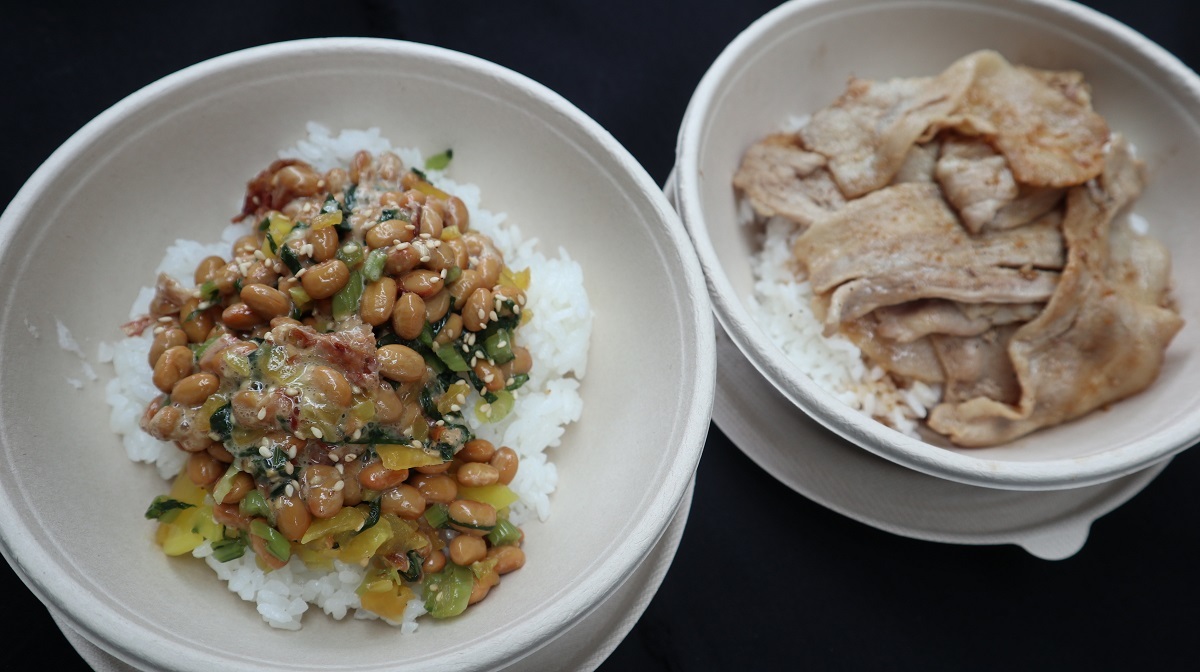 「キーフーダー」コーナーの隣に停車している赤と白の可愛らしいキッチンカーでは、『フジロック』の最大ホスピタリティエリア「オアシス」にある『フジロック』で大人気の飲食店「苗場食堂」の「きりざいめし」と、「越後名物 もち豚丼」が販売されていて、『フジロック』自慢のフェスごはんに舌鼓を打つ人たちで大いに賑わっていました。ちなみに「きりざいめし」とは、『フジロック』が開催される新潟の魚沼地方に伝わる郷土料理で、納豆に刻んだ野沢菜やたくあんなどの野菜を混ぜ合わせた「きりざい」をご飯の上にのせたもの。フェス参加中は野菜不足になったりと偏食傾向になってしまいがちですが、『フジロック』には「きりざいめし」を筆頭にバランスのとれるヘルシーメニューも豊富なので食で困ることはありません。