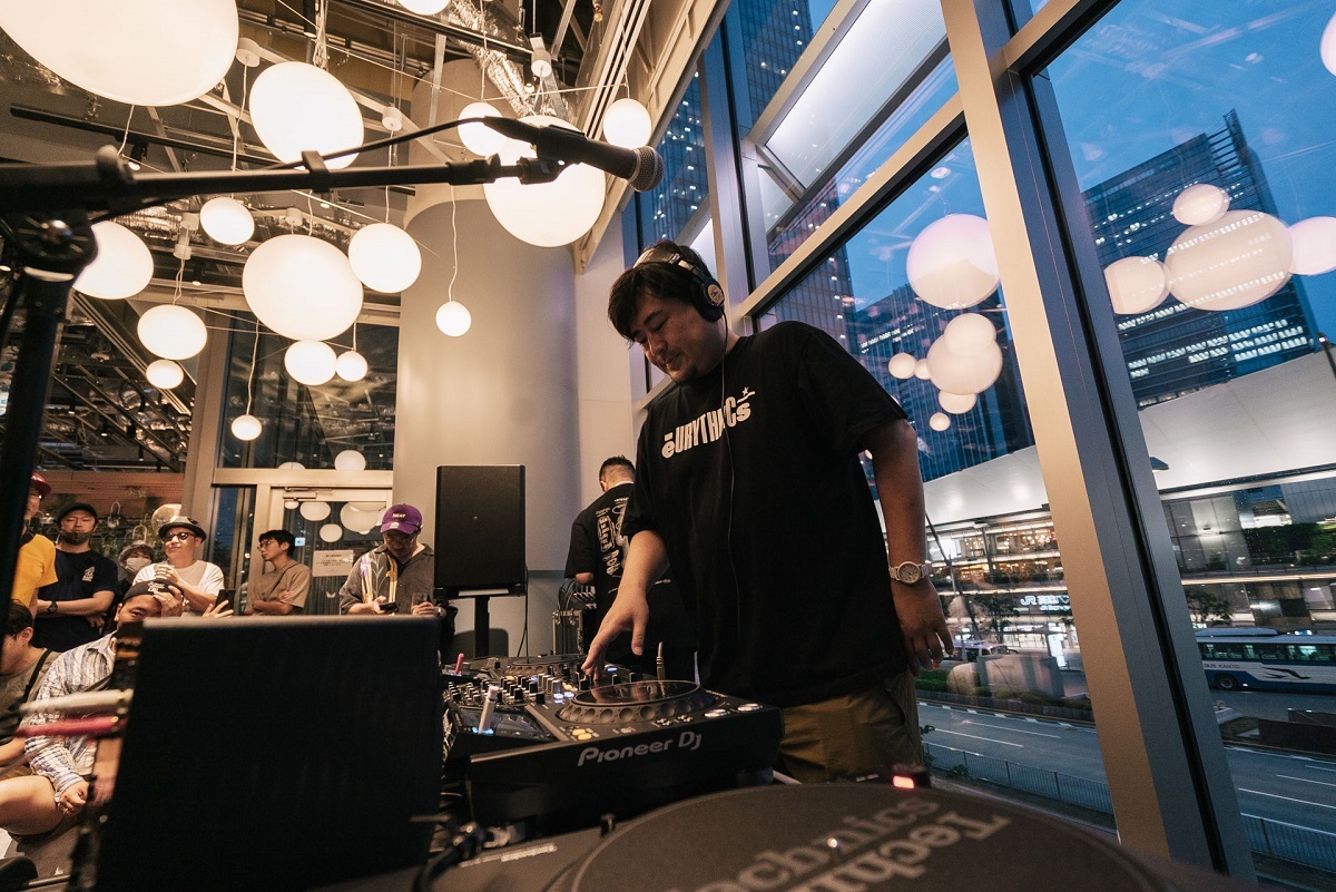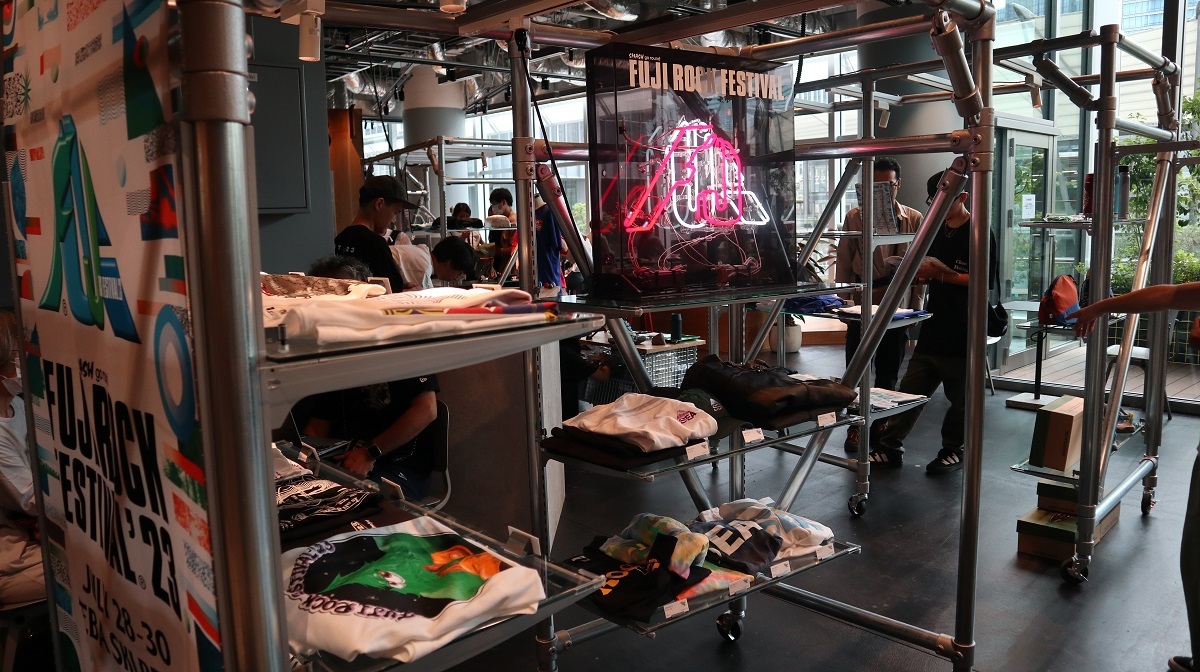 「FUJI ROCK SQUARE」には『フジロック』のフラッグがスペース中央や天井付近にどーんと飾られ、無機質な空間に合わせたような無骨な商品棚には『フジロック』のオフィシャルグッズがズラリ。ここではイベント開催中、期間限定で『フジロック』のオフィシャルショップ「GANBAN/岩盤」が出店しているので『フジロック』のチケット購入も可能。グッズを手に取ってみることもできます。また、夜19時からは『フジロック』ゆかりのDJ EVENTも実施され、初日はDJ TASAKAが出演。『フジロック』らしく、音が溢れる空間が生まれていました。なお、「GANBAN/岩盤」のポップアップストアは21時までの営業なので、仕事帰りに立ち寄ることもできそうです。