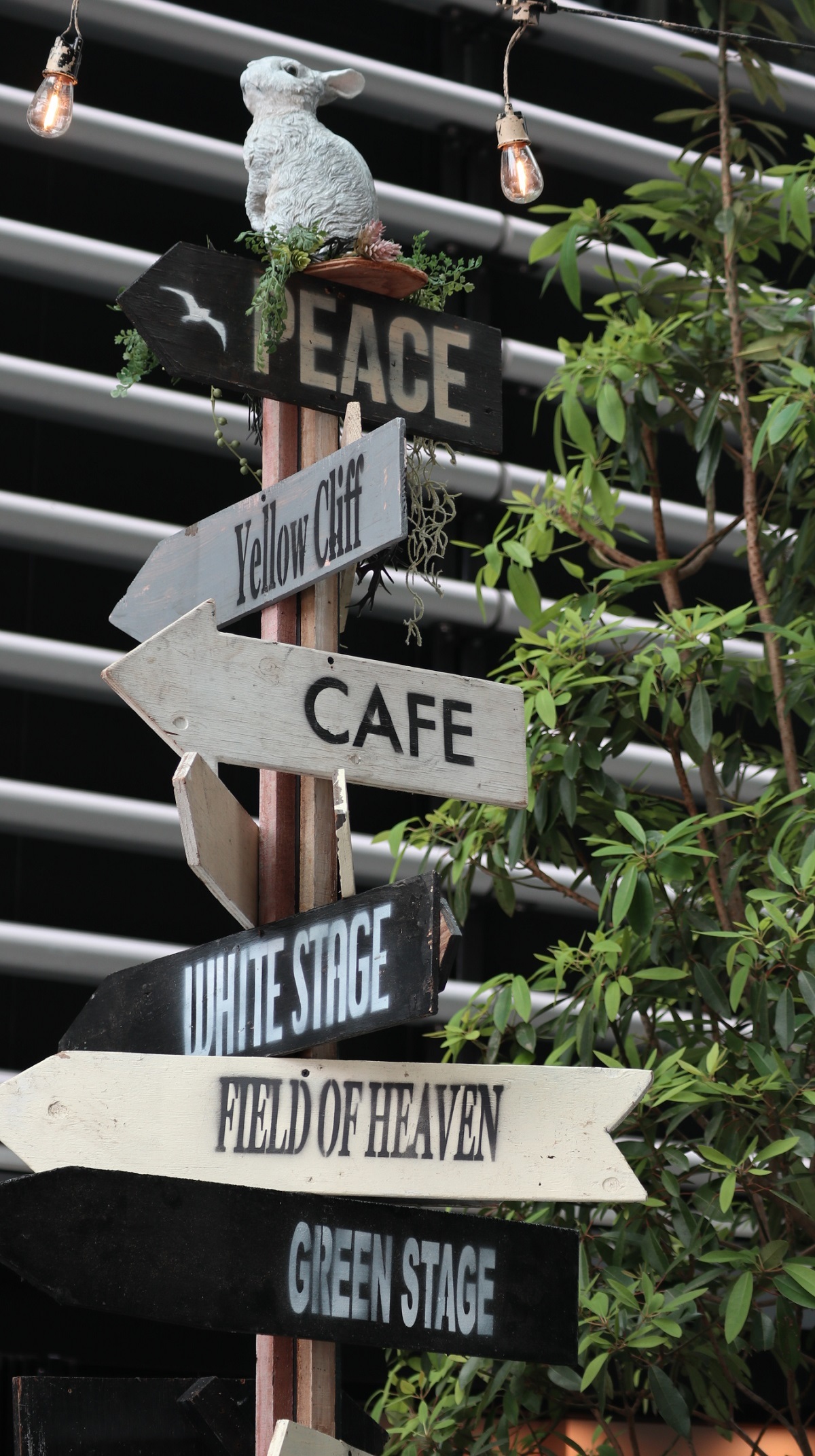 さらにゲートから中を見ると、スペース中央あたりにそびえ立つ塔から放射状にのびたガーランドのカラフルなフラッグがスペース奥までの上空ではためき、ウッディな行き先案内板が飾られていたりと、何やら見覚えのあるような景色が。そう、そこは『フジロック』の場外エリアにある「PYRAMID GARDEN」の世界! 青い芝生の上に独特な世界観を持つあの神秘的な景色が一瞬で思い起こされるミニ・ピラミッドガーデンのような空間を前に、“そうか! だからこのスペースの名前は「FUJI ROCK GARDEN」なんだ!”と内心興奮気味に納得。