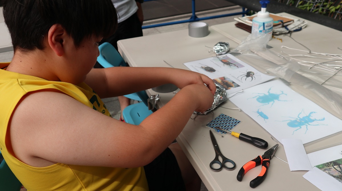 メタルムシとは、新聞紙を丸めてムシの胴体をつくり、針金を曲げて足や角、羽を思いのままに形づくって、世界でひとつの、自分だけのオリジナルのハンドメイド・ムシのこと。アーバンなビルの中でも「KIDSの森」同様、子どもたちがムシづくりに夢中になっていました。