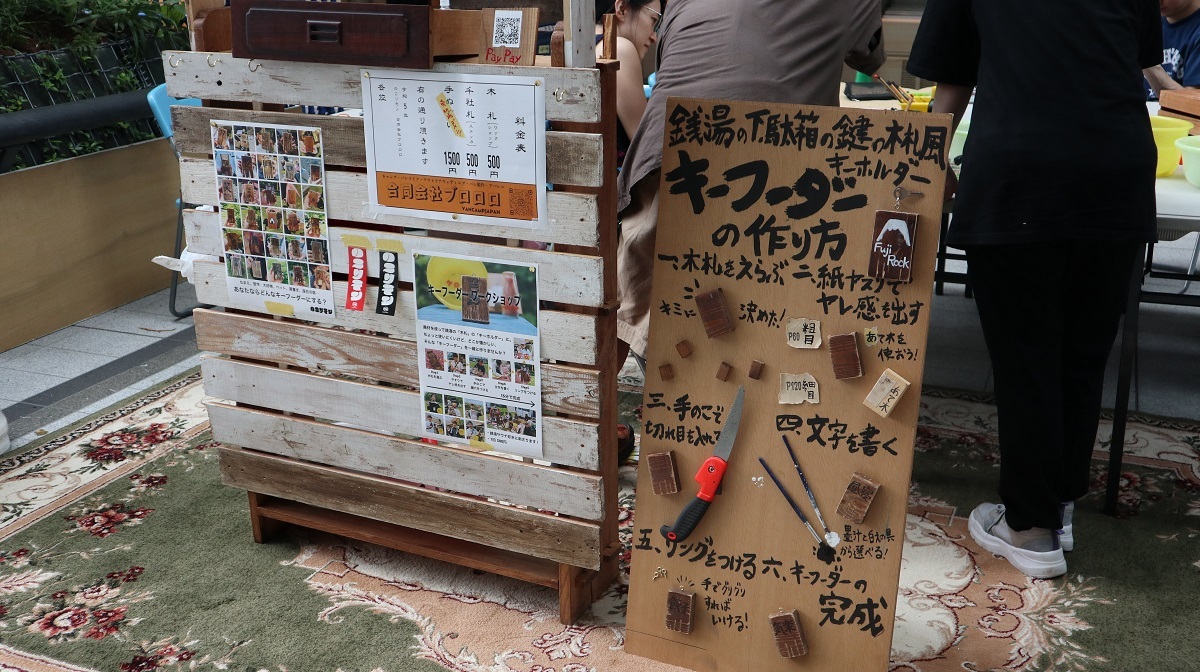 さらに進むと、もうひとつのワークショップ、のこりモン「キーフーダー」があり、そこでは不要になった銭湯の鍵の木札を使って、ノコギリで切れ目を入れたりヤスリで削ってから自由にペイントするというアクティビティ体験ができます。所要時間はひとり約10分で、こだわる人はもっと長く楽しめるとのこと。こちらもファミリー参加者たちで溢れ、フリーライブ開催中も満席が続くほどの盛況ぶりでした。このワークショップは今年『フジロック』初登場予定で、「アヴァロンの森」で楽しめるそうです。