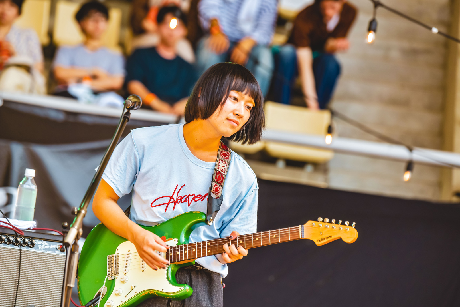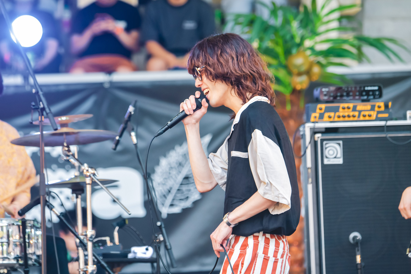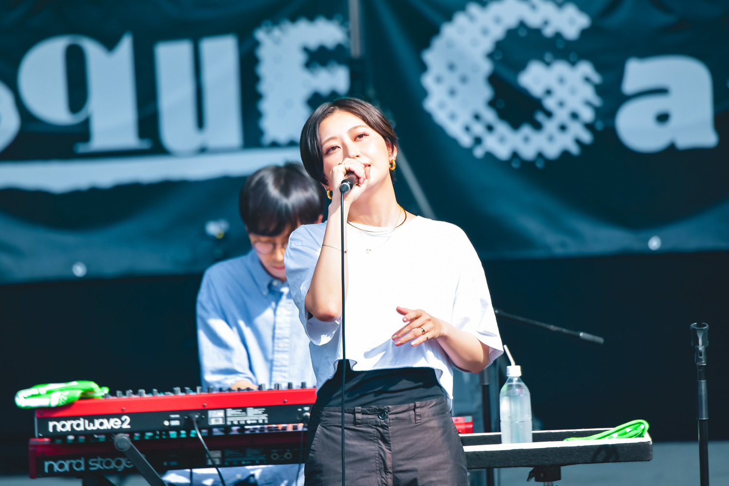 「yonawo x 鈴木真海子 x Skaai最終日でーす! 最高のイベントだね。全アーティストカッコ良いから間違いないぞ。ただ暑いね」と何度も暑いと連発していたがそれもそのはず、ステージに直射日光が突き刺す時間帯。そんな気候でも、ジャジーでクールな「19」、シンセが清涼感をくれたボサノヴァ調の「どっかの土曜日」でナイスグルーヴで満たしてゆく。