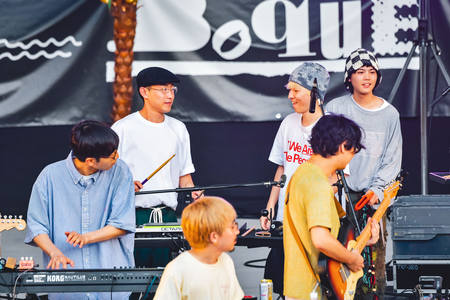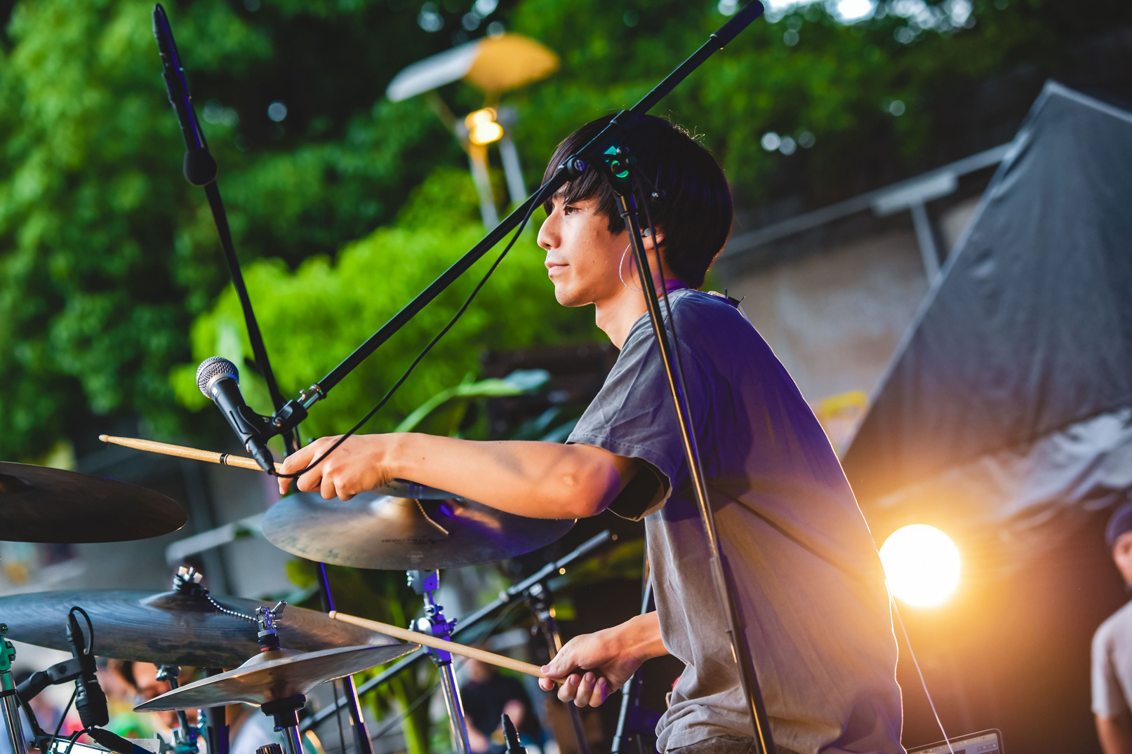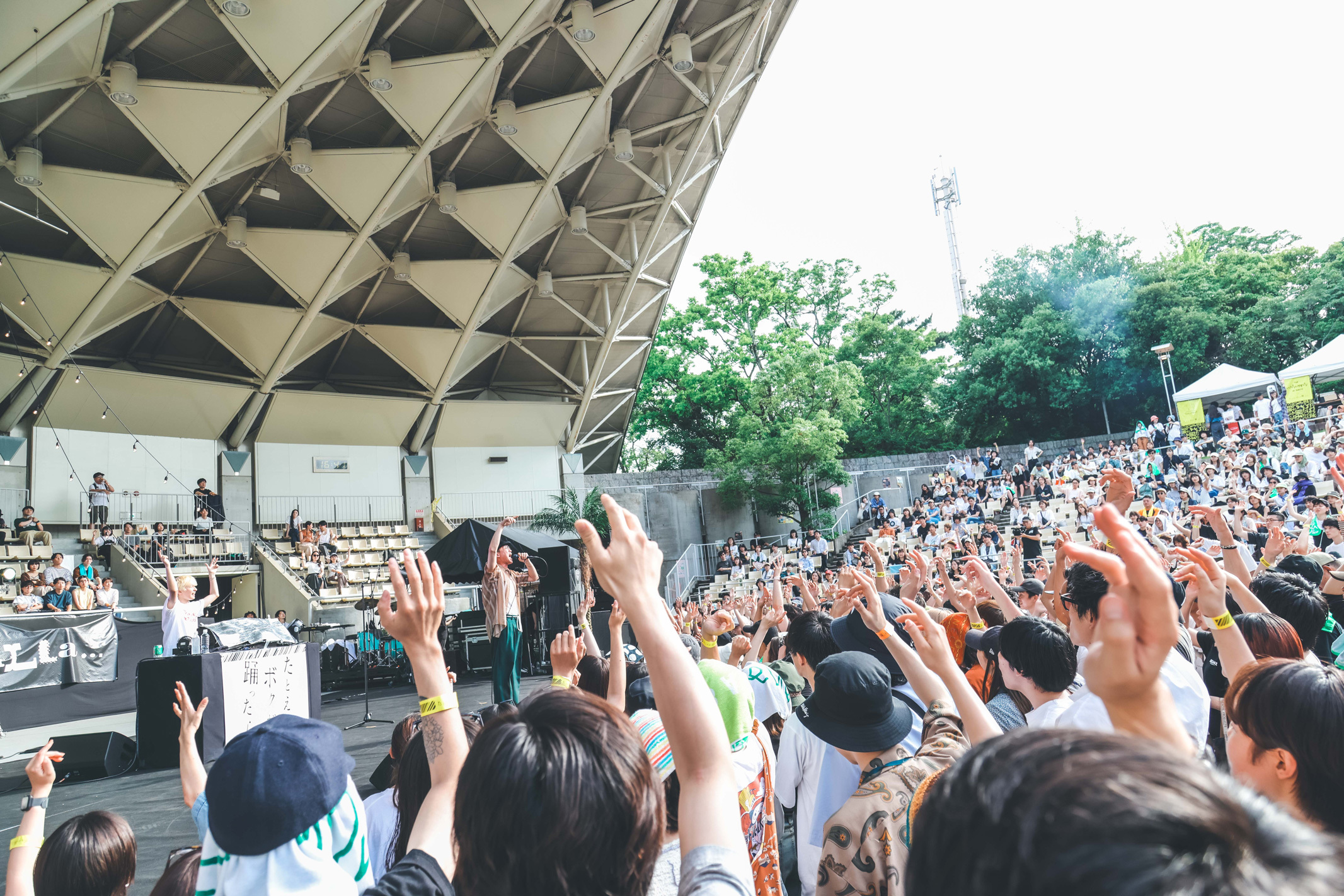 過去の開催時において、天候に悩まされることが多かった「ボク踊」。しかしこの日は見事な晴れ。前日の雨の湿気で蒸し暑さも加わり、熱中症対策が必要ではあったが、申し分のない天気だ。服部緑地野外音楽堂には続々とオーディエンスが集合し、入場を始めていた。エントランスには「ボク踊」おなじみの暖簾がかけられ、ステージ上にはイベントロゴをあしらった爽やかなグリーンのドロップが吊られている。ステージに立つバナナの木やヤシの木が、南国感を演出していた。