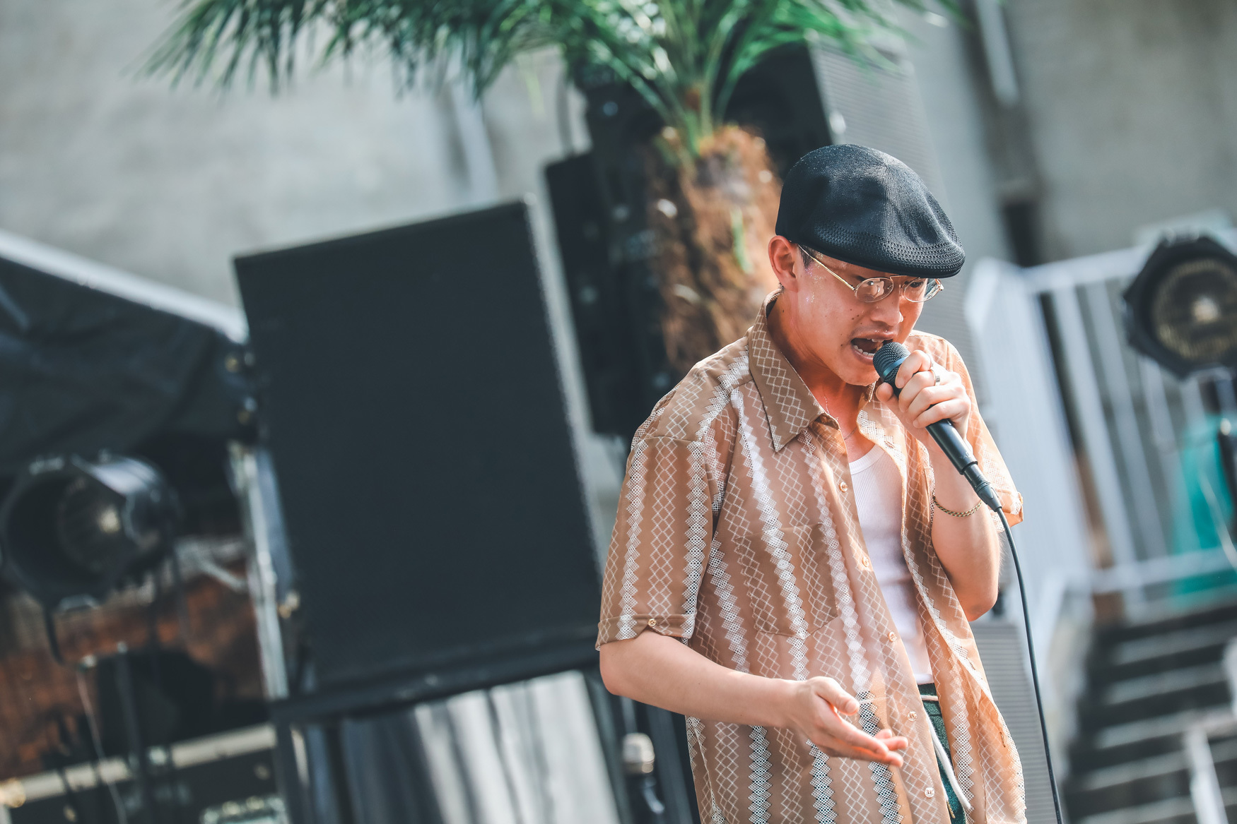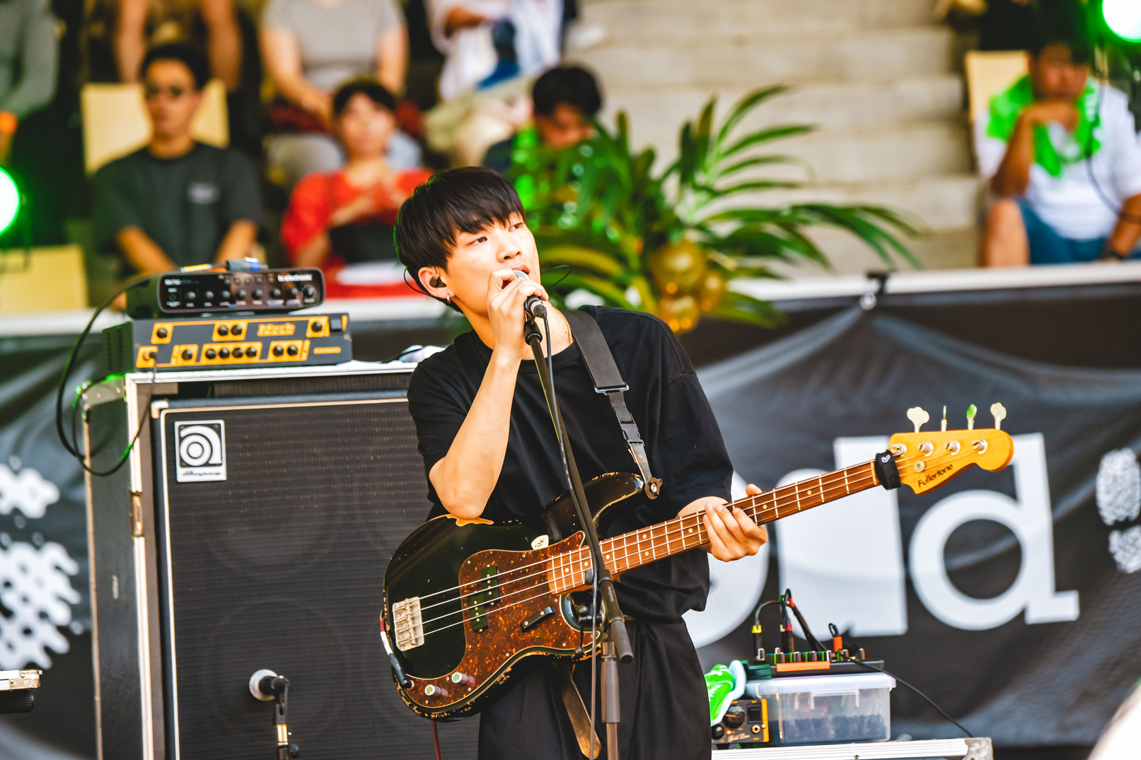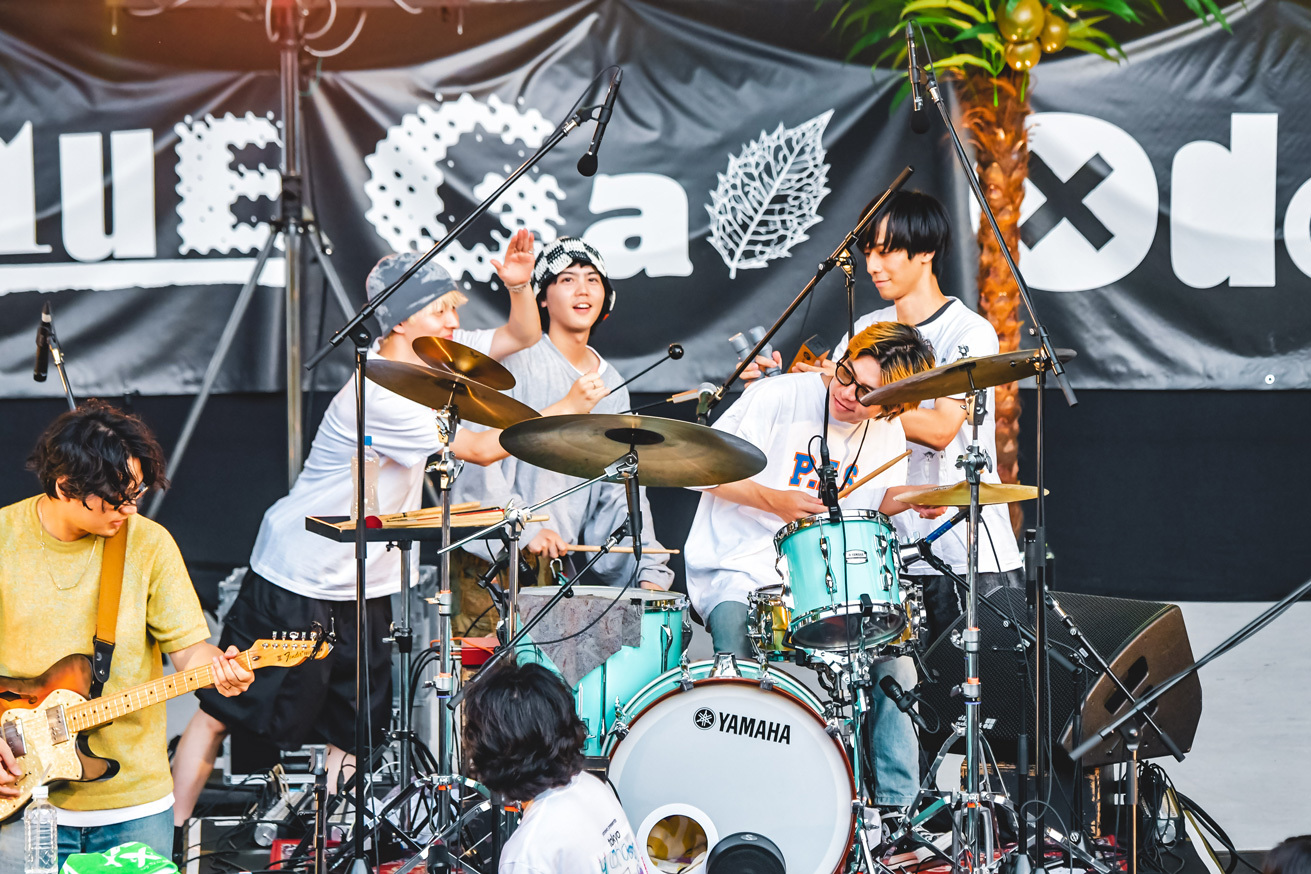 過去の開催時において、天候に悩まされることが多かった「ボク踊」。しかしこの日は見事な晴れ。前日の雨の湿気で蒸し暑さも加わり、熱中症対策が必要ではあったが、申し分のない天気だ。服部緑地野外音楽堂には続々とオーディエンスが集合し、入場を始めていた。エントランスには「ボク踊」おなじみの暖簾がかけられ、ステージ上にはイベントロゴをあしらった爽やかなグリーンのドロップが吊られている。ステージに立つバナナの木やヤシの木が、南国感を演出していた。