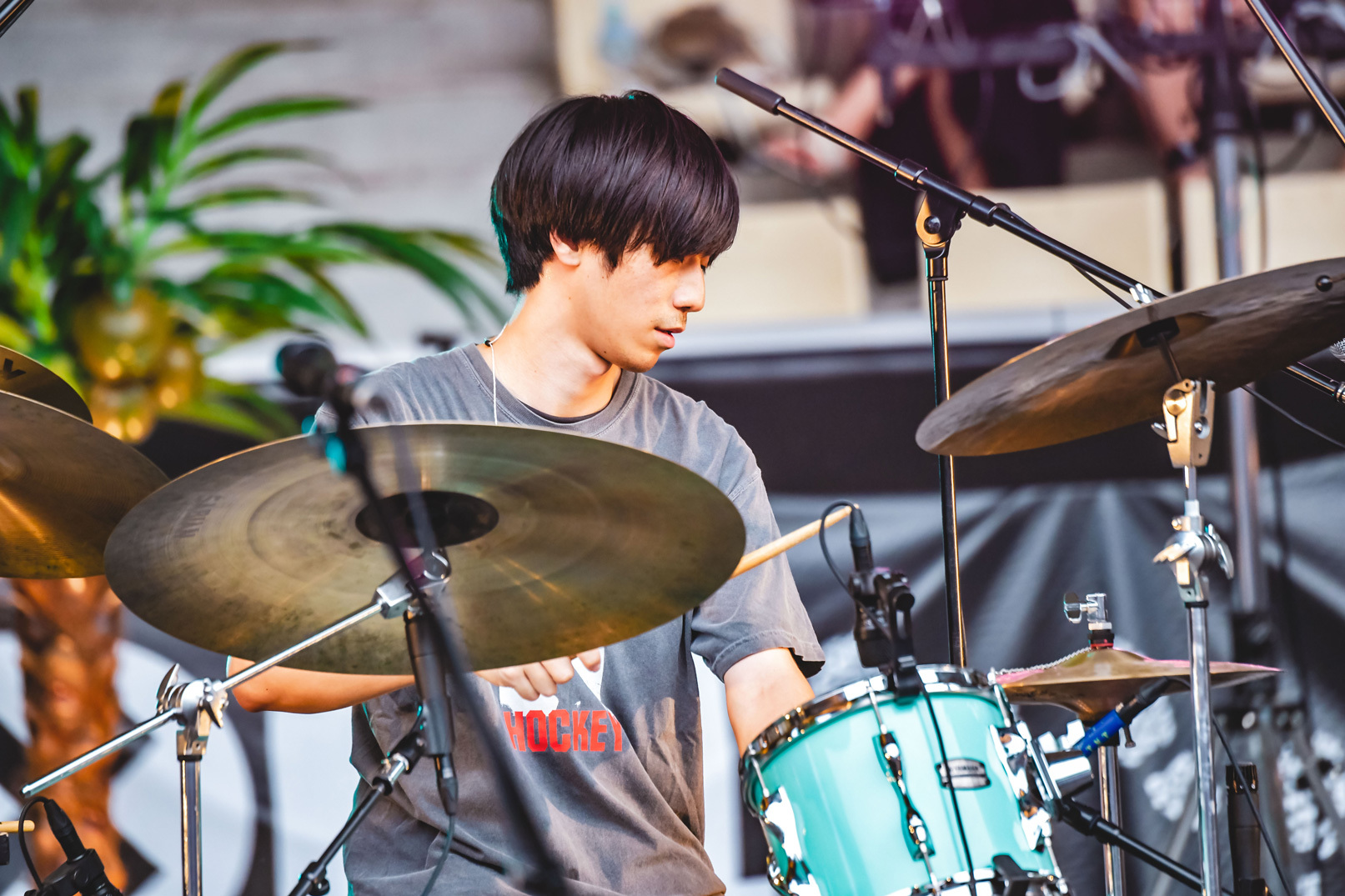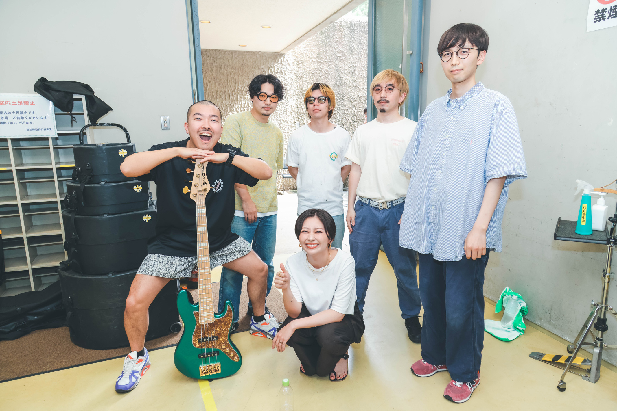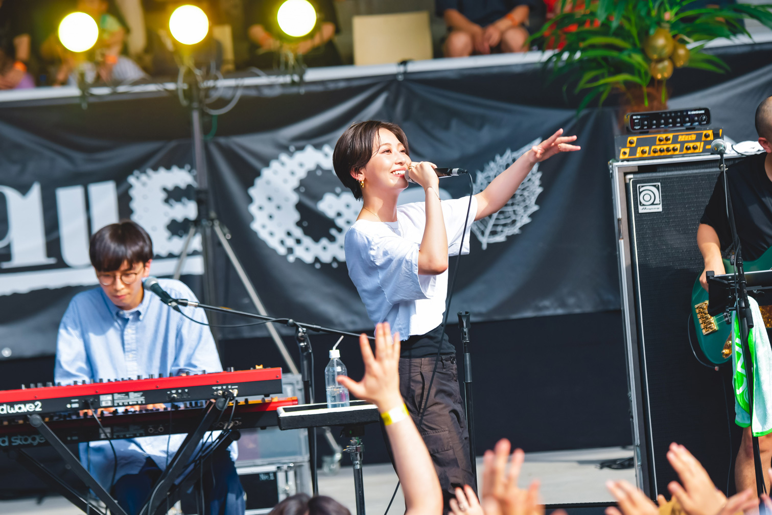 MCでは荒谷がキーボードの前に座り「こんな感じでゆるっとパキッと楽しくやっていくんで、引き続きよろしくお願いします!」と「yugi」をメロウに披露。どこからかセミの鳴く声が聞こえてくる。さらに夕暮れにピッタリの「焦がれ Night」を美しく奏でる。野元喬文(Dr)は目を閉じて1音1音を丁寧に叩き出す。アンサンブルが実に素晴らしく、客席はじっくりと聴き入っていた。演奏が終わると子どもの声が聞こえ、荒谷が「終わったよー! 聞いてくれた?」と優しく話しかける。続いては「cart pool」から「ijo」へのメドレーパート。田中慧(Ba)のベースラインに荒谷のハイトーンボイスが柔らかく絡みつく。