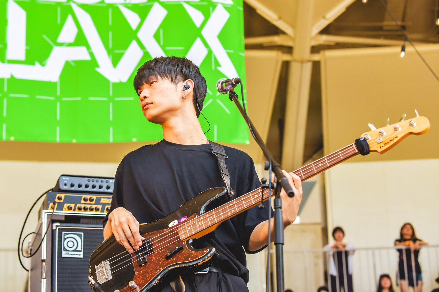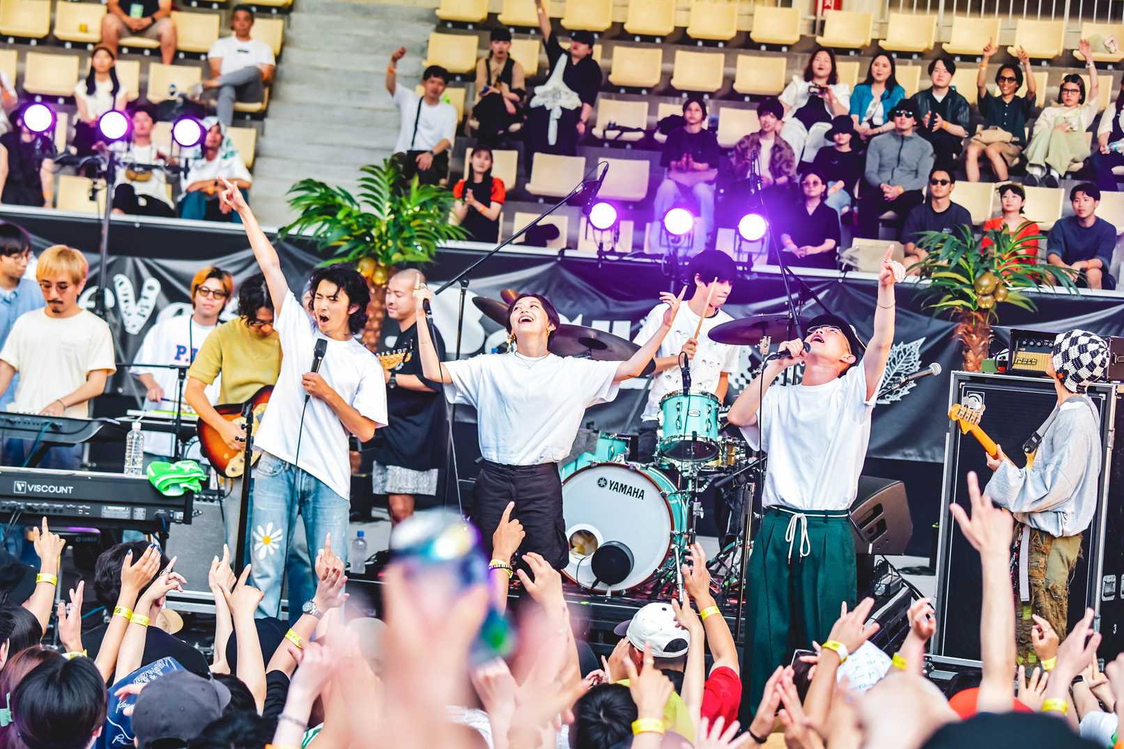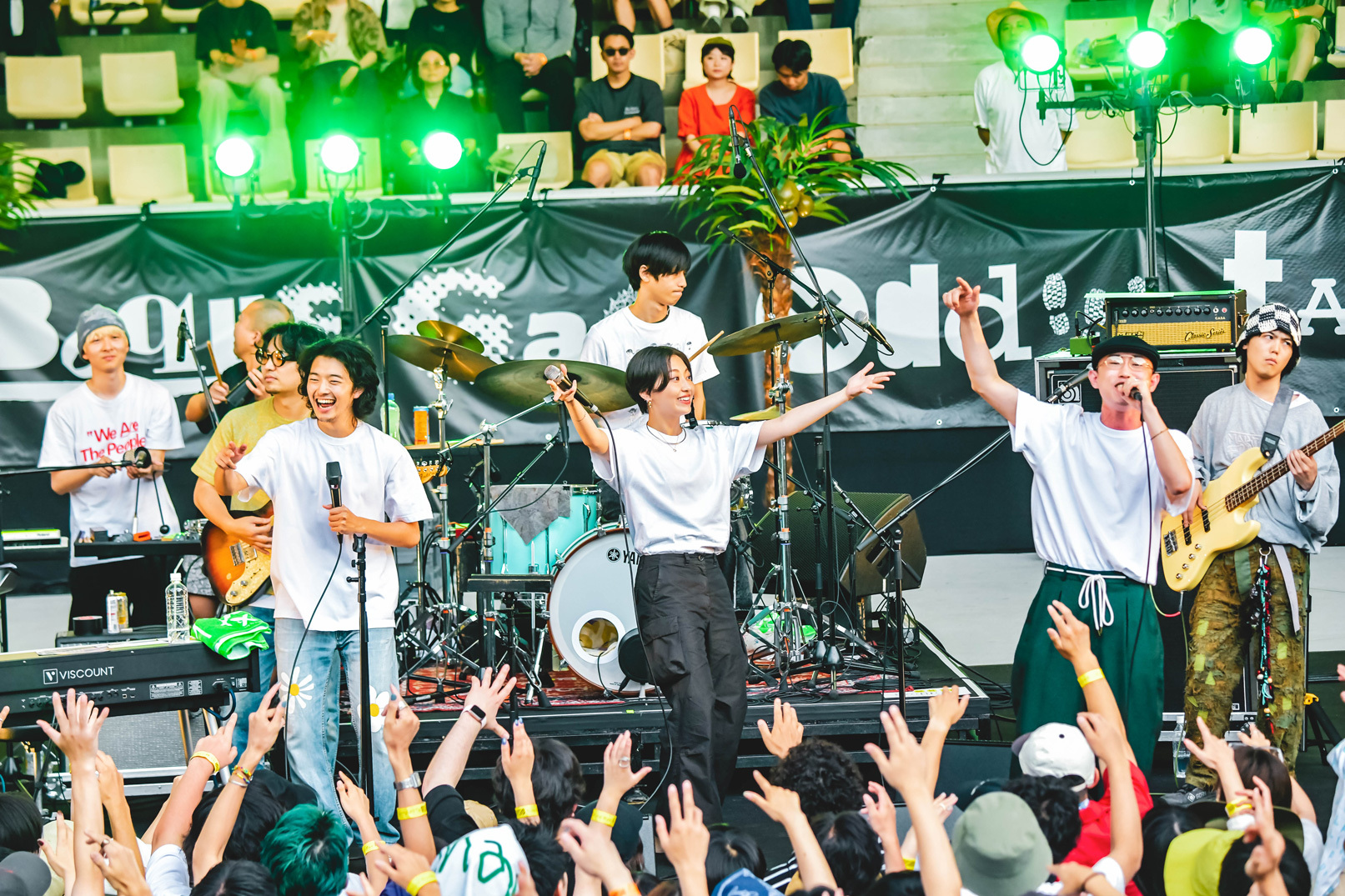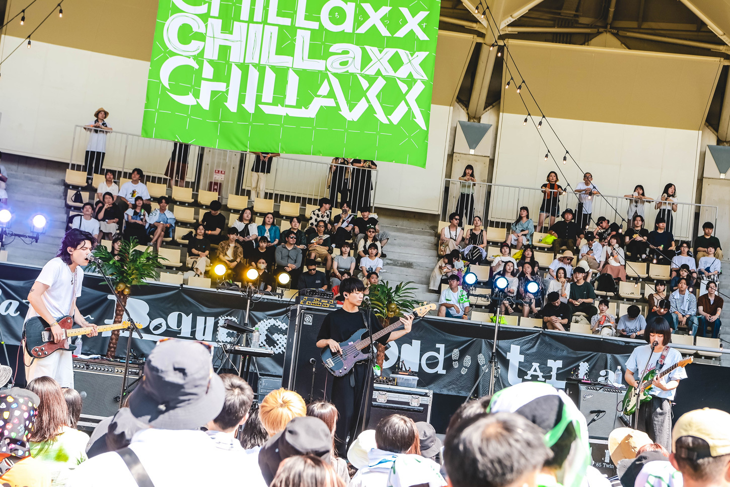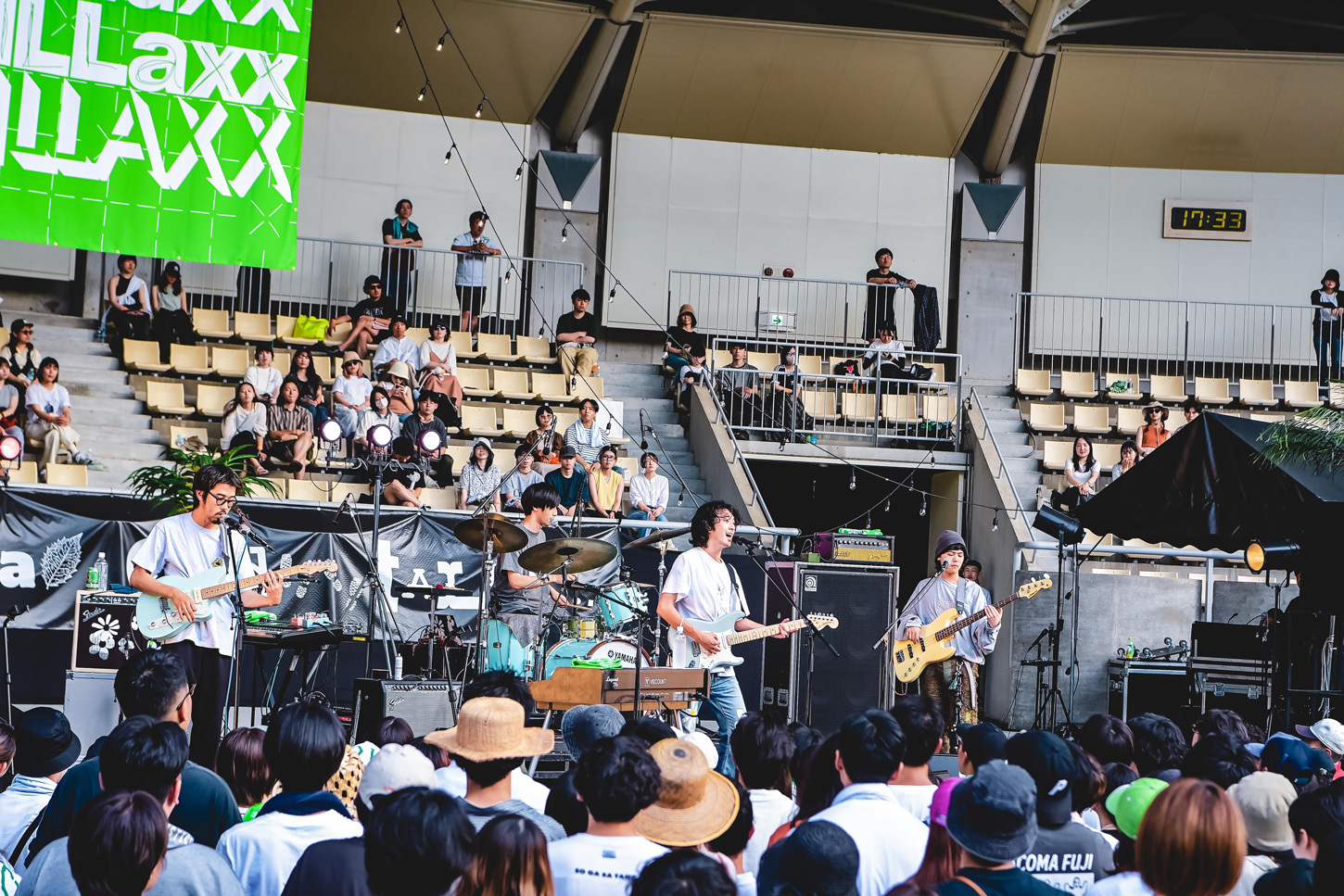 そして大トリは、2021年の『Chillaxx』にも出演したことがあるyonawo。サウンドチェックをまったり行い、そのまま板付でふわりとライブをスタート。メンバーを呼ぶ声の大きさやグッズを持つ人の多さから、期待値の大きさをひしひしと感じる。まずは「tonight」でしっとり聞かせてゆく。荒谷翔大(Vo.Key.Gt)のまろやかな英語詞とメロウなバンドサウンドが最高に美しい。続いてどうにも感情が動かされる「苺」で暑さを洗い流し、新曲の「Stay」を披露。荒谷の色っぽい歌声、斉藤雄哉(Gt)のうねるギター、さらに後半のゴリッとした展開が全身を心地良く包み込む。
