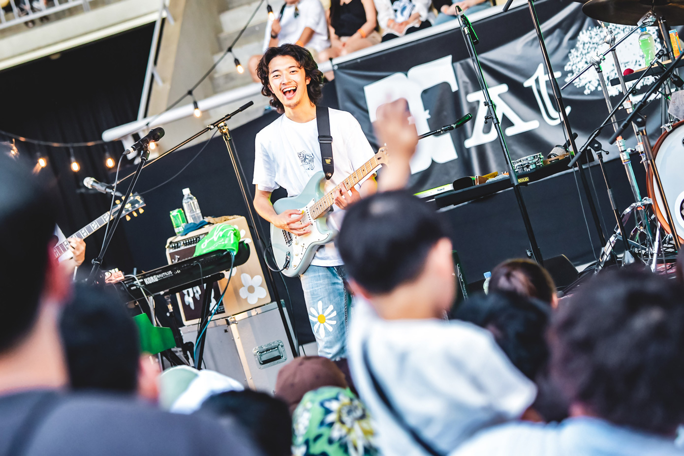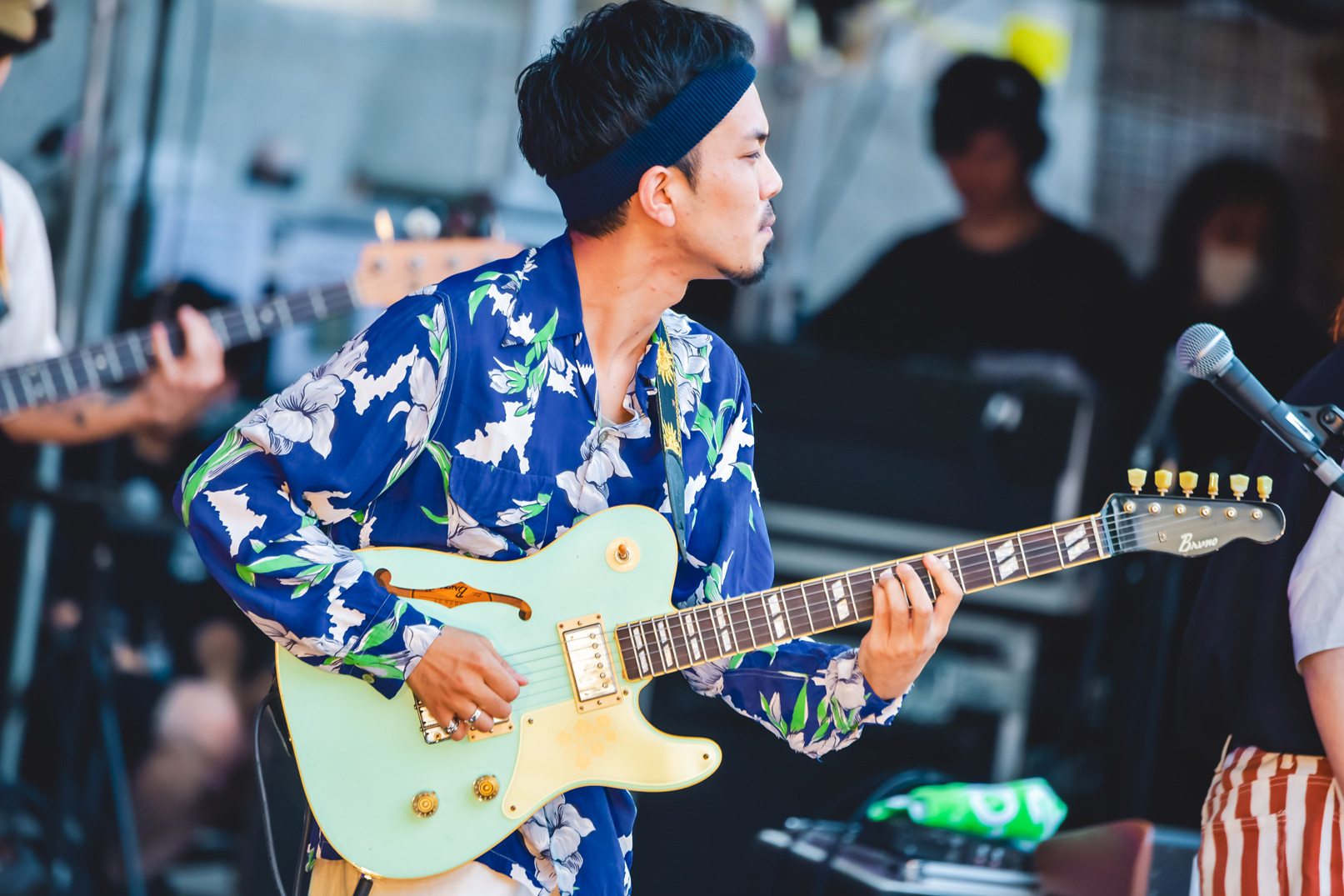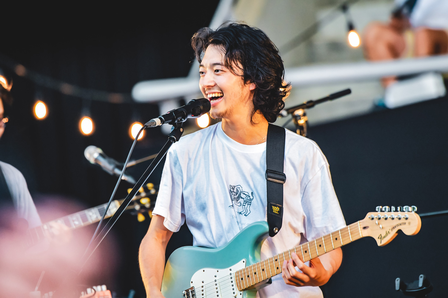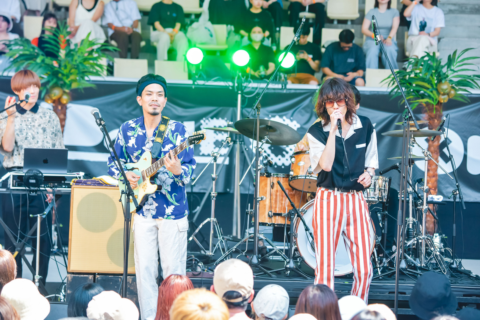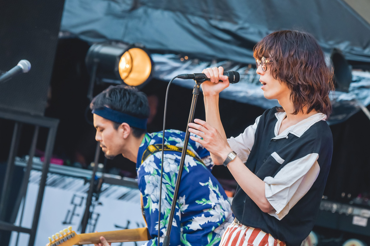 本編トップバッターは離婚伝説。松田歩(Vo)、別府純(Gt)からなるDIYバンドで、2022年1月に結成したばかり。まだ関西でのライブもそれほど多くはなく彼らもこの日が初野外とあって、このタイミングで見れたのはかなり貴重だ。今回はサポートにキーボード、ベース、ドラム、マニュピレーター&ギターの4人を迎えた6人編成。バンドメンバーと別府が先にステージに登場して音を鳴らす。その空気感が「楽しくて堪らない!」といった様子で、客席も自然に温かい雰囲気に。そこに松田が颯爽と現れて「愛が一層メロウ」を歌い始める。ブーツカットのパンツを着こなしたレトロな格好、一声放つと一気に惹きつけられる存在感には驚きを隠せない。