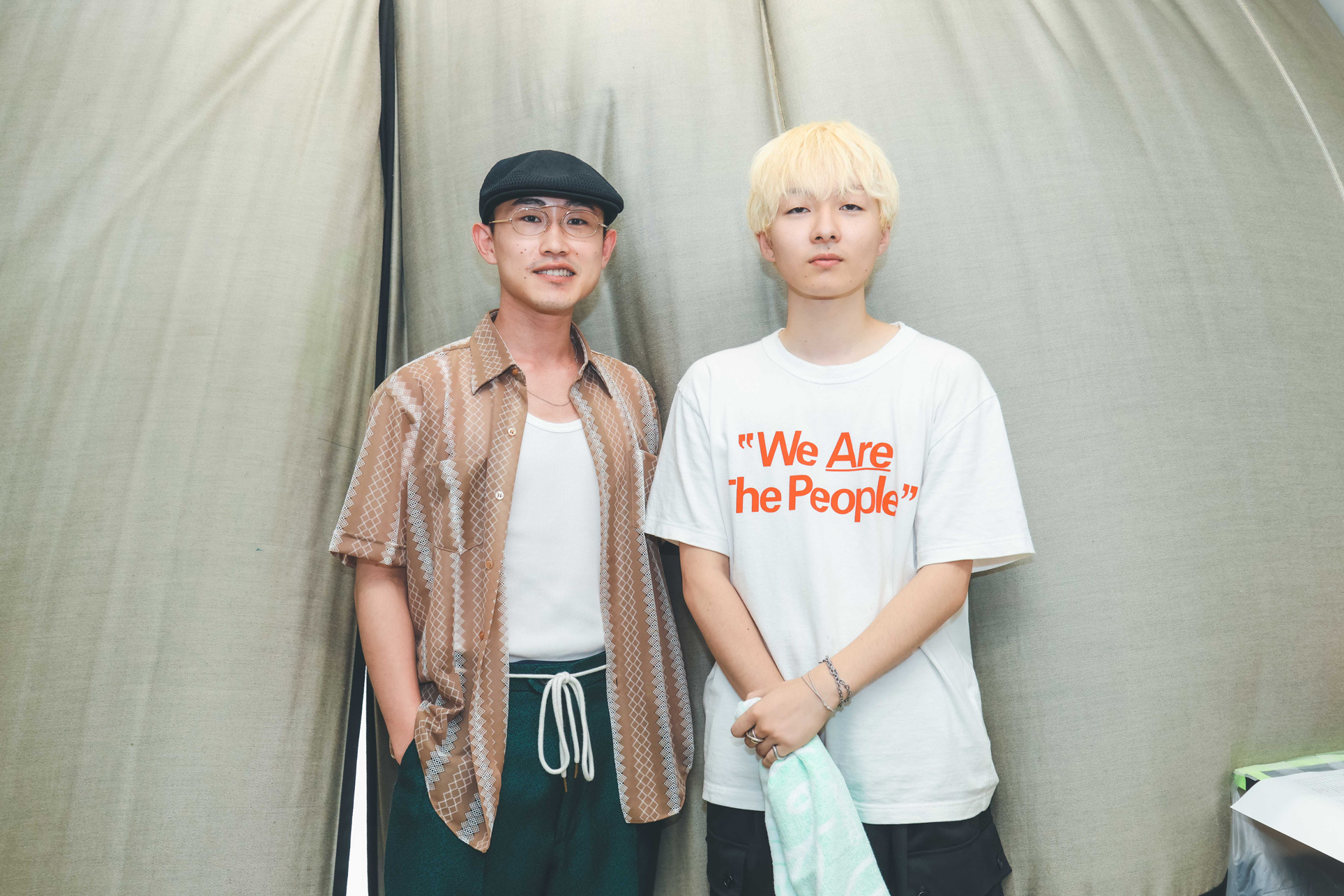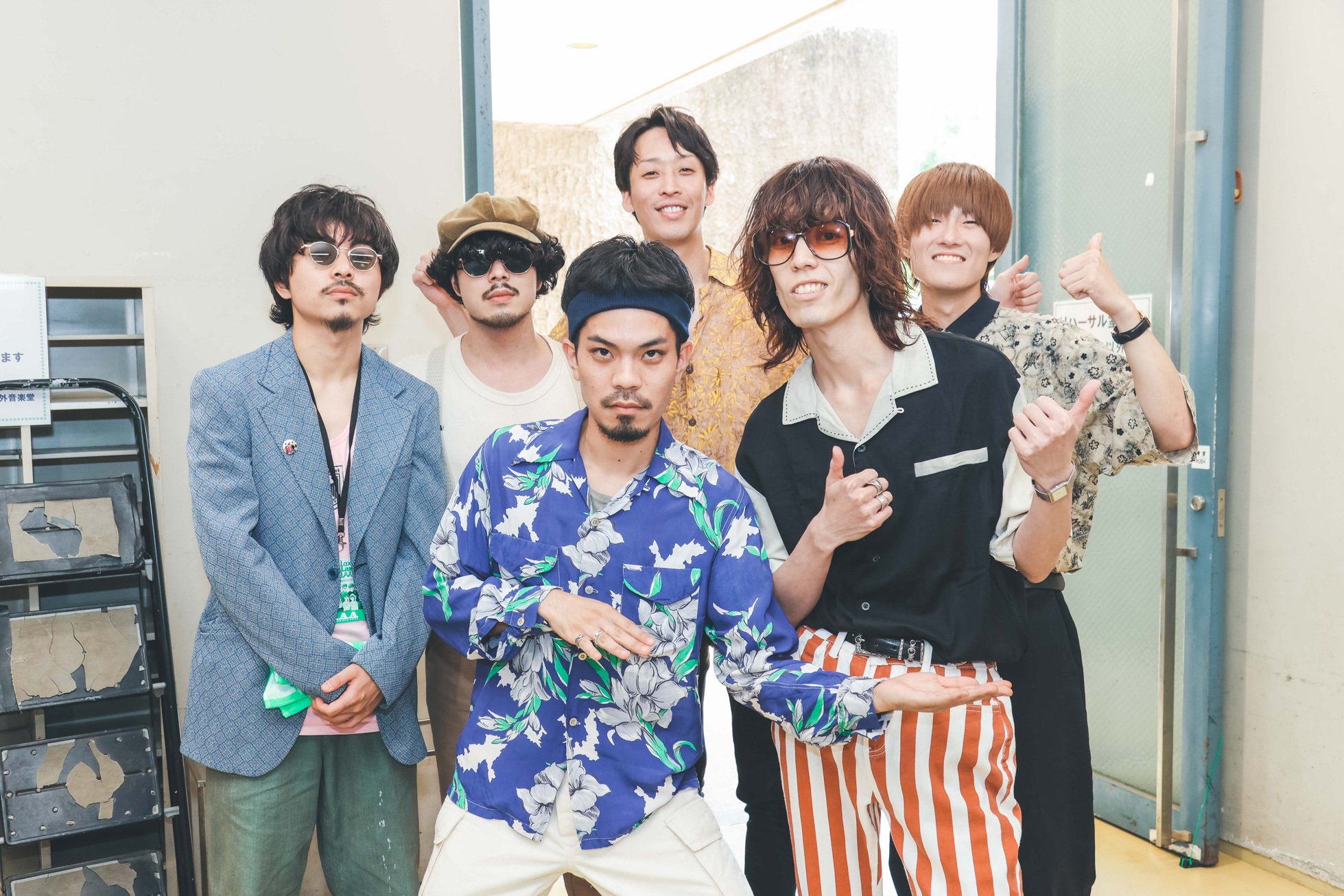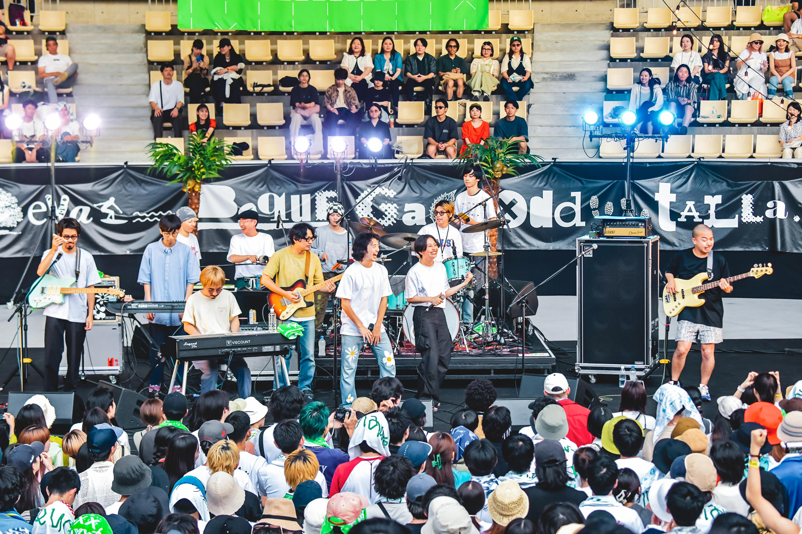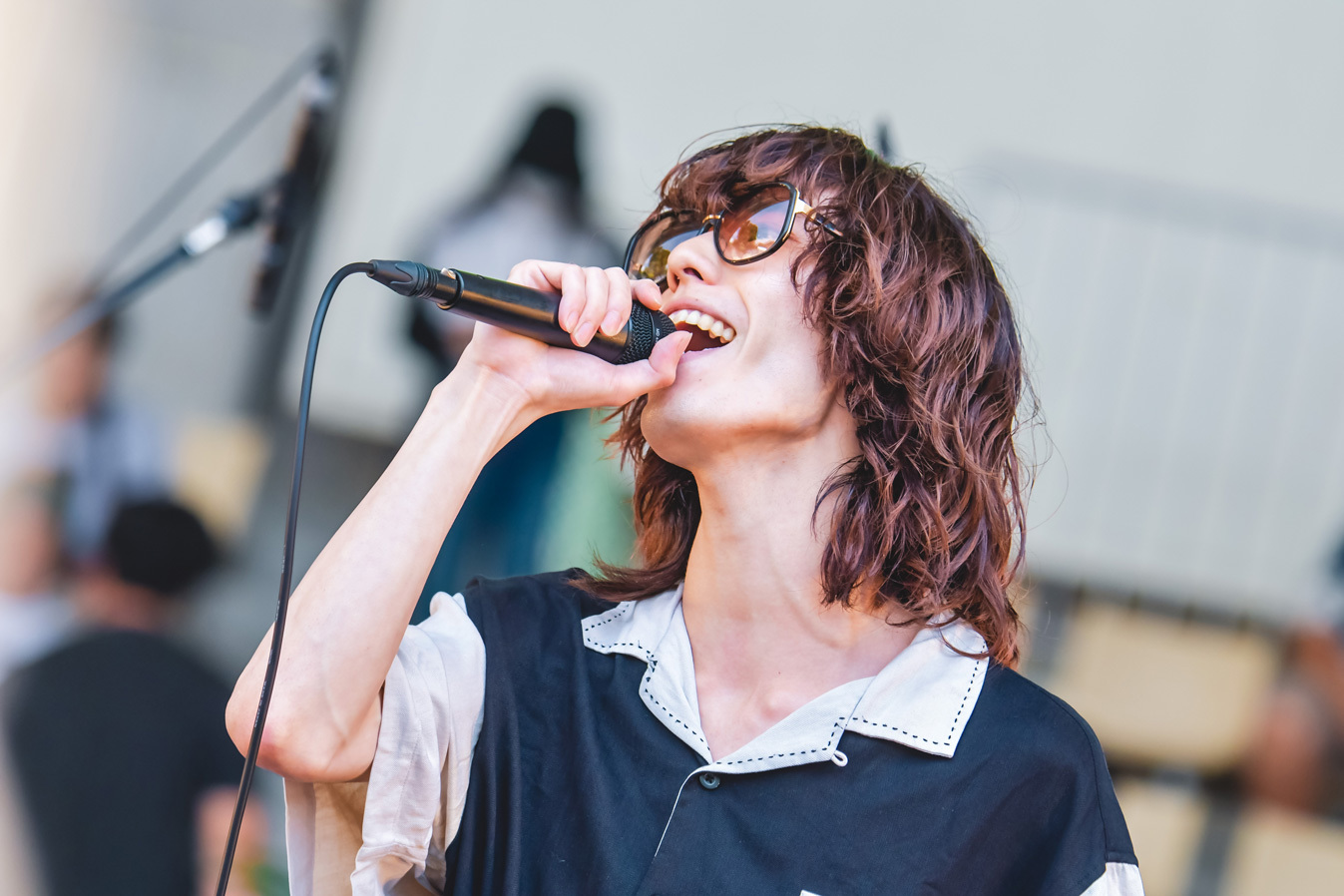 本編トップバッターは離婚伝説。松田歩(Vo)、別府純(Gt)からなるDIYバンドで、2022年1月に結成したばかり。まだ関西でのライブもそれほど多くはなく彼らもこの日が初野外とあって、このタイミングで見れたのはかなり貴重だ。今回はサポートにキーボード、ベース、ドラム、マニュピレーター&ギターの4人を迎えた6人編成。バンドメンバーと別府が先にステージに登場して音を鳴らす。その空気感が「楽しくて堪らない!」といった様子で、客席も自然に温かい雰囲気に。そこに松田が颯爽と現れて「愛が一層メロウ」を歌い始める。ブーツカットのパンツを着こなしたレトロな格好、一声放つと一気に惹きつけられる存在感には驚きを隠せない。