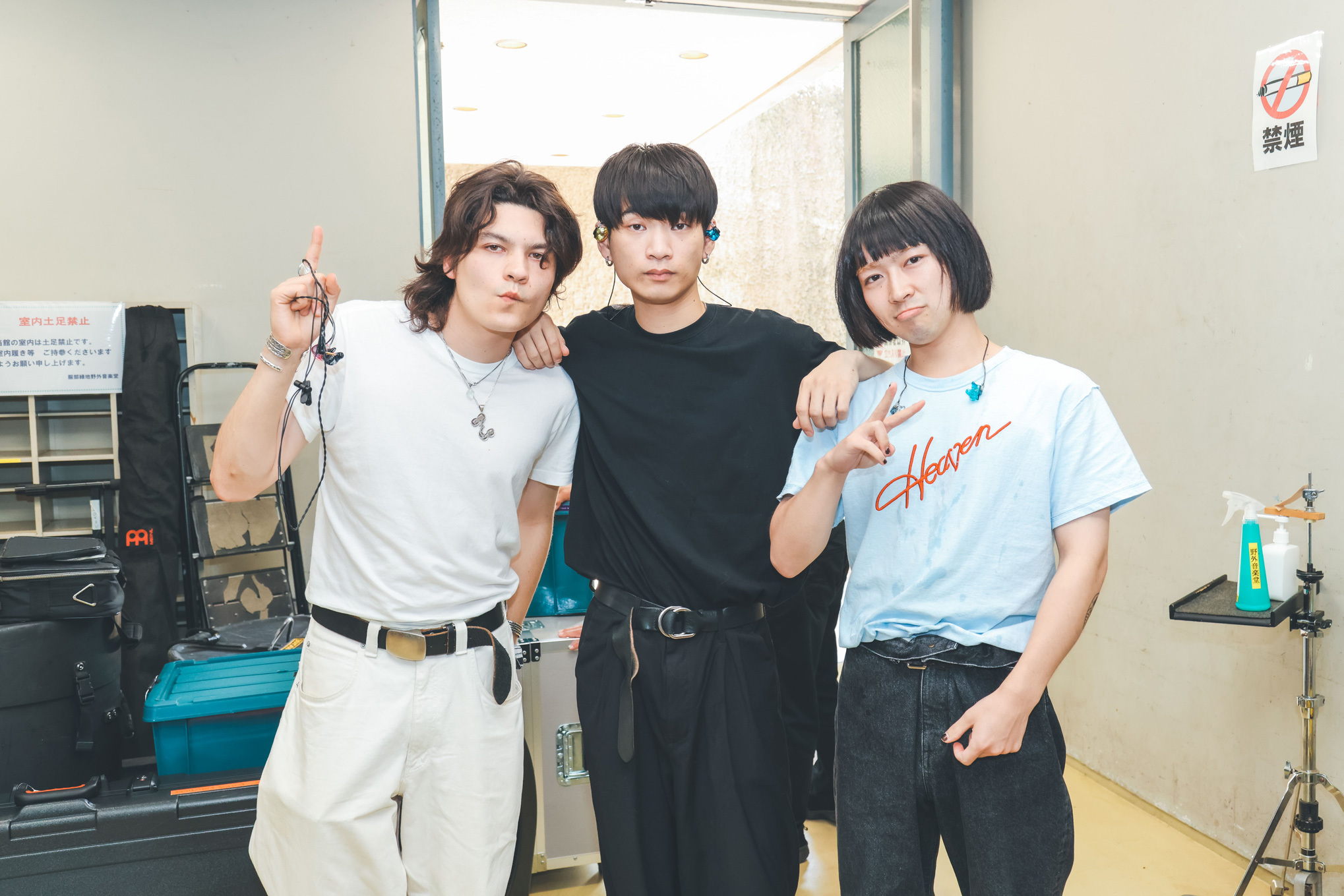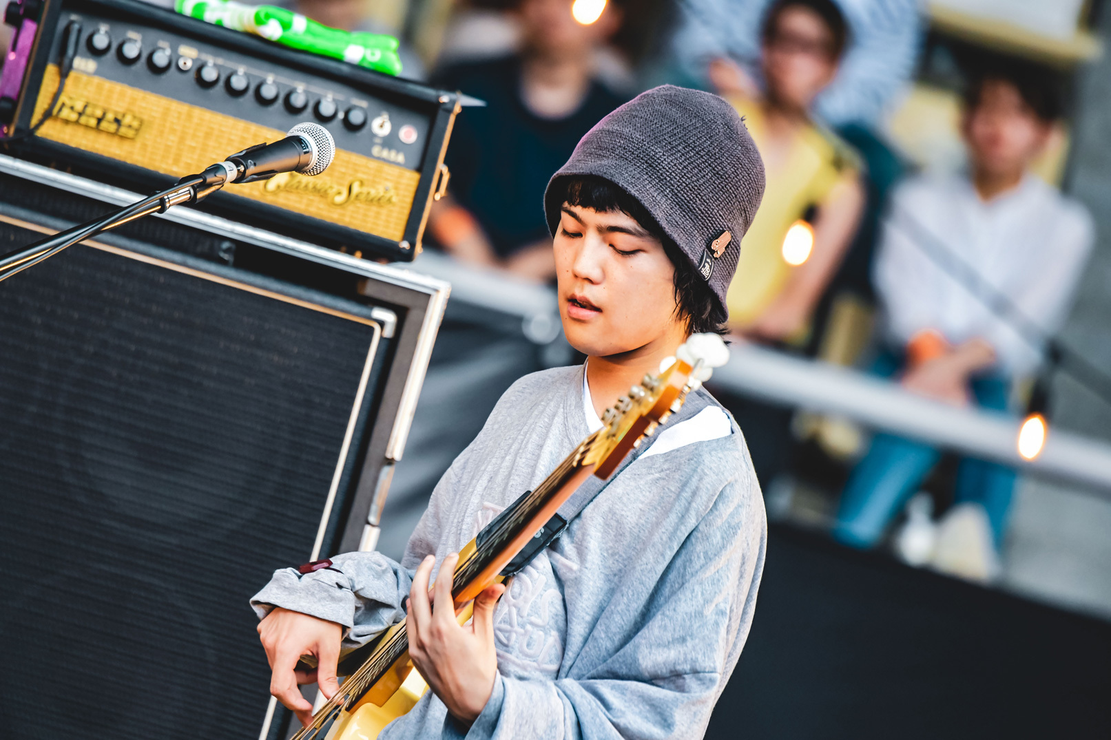2番手はego apartment。Dyna(Laptop.Ba)、Peggy Doll(Gt.Vo)、Zen(Gt.Vo)からなる、1998年生まれ3人組の彼ら。それぞれの足元にはエフェクターがずらりと並ぶ。1曲目は「NEXT 2 U」。低音ボーカルのZenと音域の広いPeggy Dollのボーカルが交互に歌われ、サウンドに奥行きを作り出す。キャッチーでどこか哀愁漂うギターリフとコーラスワークが心地良い「mayonnaise」に続いてはシームレスに「N o o N」、「REACH!」をプレイ。変幻自在に変化するギターの音色が面白く、実験的な要素も感じられるようだ。