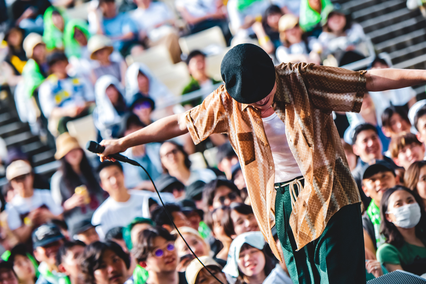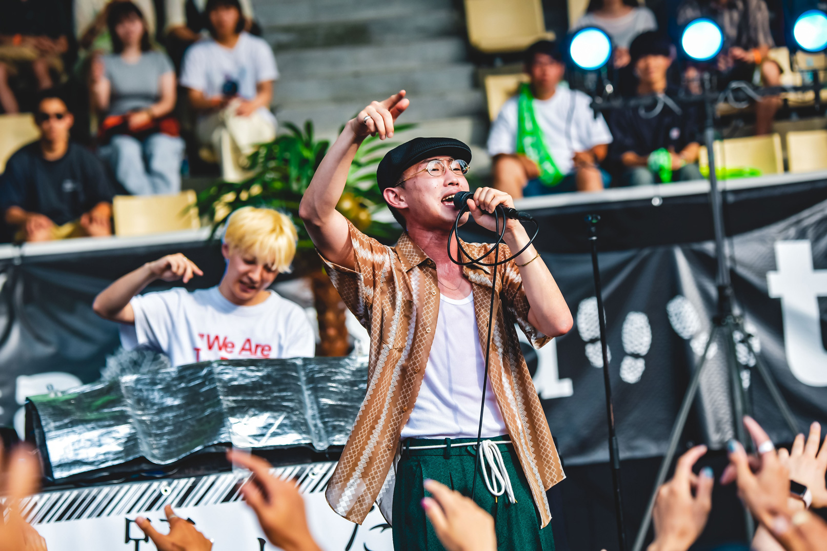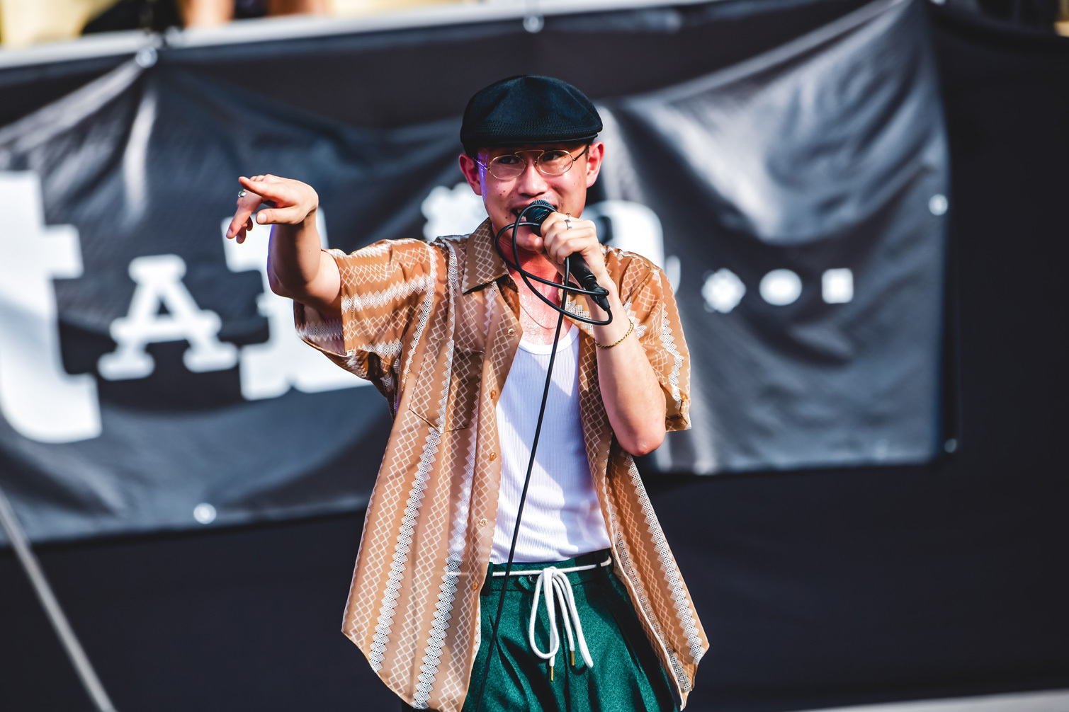 日が傾いて涼しくなった頃に登場したのはSkaai。待ってましたと言わんばかりの大歓声が湧き起こる。DJはプロデューサーで盟友の、金髪にしたuin。そんなuinがプロデュースを手掛けた「Nectar.」に続いて「BEANIE」を熱量高く叩き込む。さらに「HOMEWORK」をキレキレで披露。波に乗りまくっている様子だ。