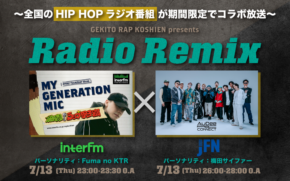 10代最大級のMCバトル「激闘!ラップ甲子園」、通称"激ラ"のラジオ番組・interfm『MY GENERATION MIC -激闘!ラップ甲子園 -』が、全国のHIP HOPラジオ番組と繋がり、期間限定でコラボレーション放送している企画「Radio Remix」。そのコラボ第2弾が、株式会社ジャパンエフエムネットワーク(以下、JFNC)が制作する人気プログラム『AuDee CONNECT』(毎週月曜~木曜 26:00~28:00放送)木曜日の梅田サイファーとタッグを組み、『AuDee CONNECT』の人気コーナー「リスナー韻天下一武道会」に Fuma no KTRが挑戦する。