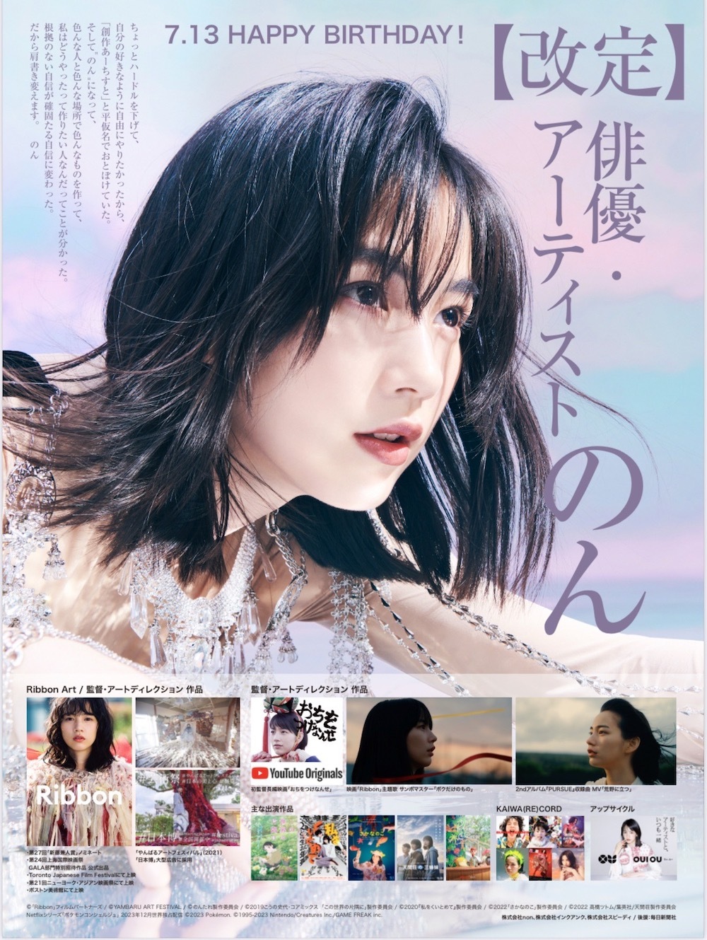 「女優・創作あーちすと」のんが、誕生日である本日・7月13日より「俳優・アーティスト」のんに肩書を改定することを毎日新聞全国版の朝刊で発表した。