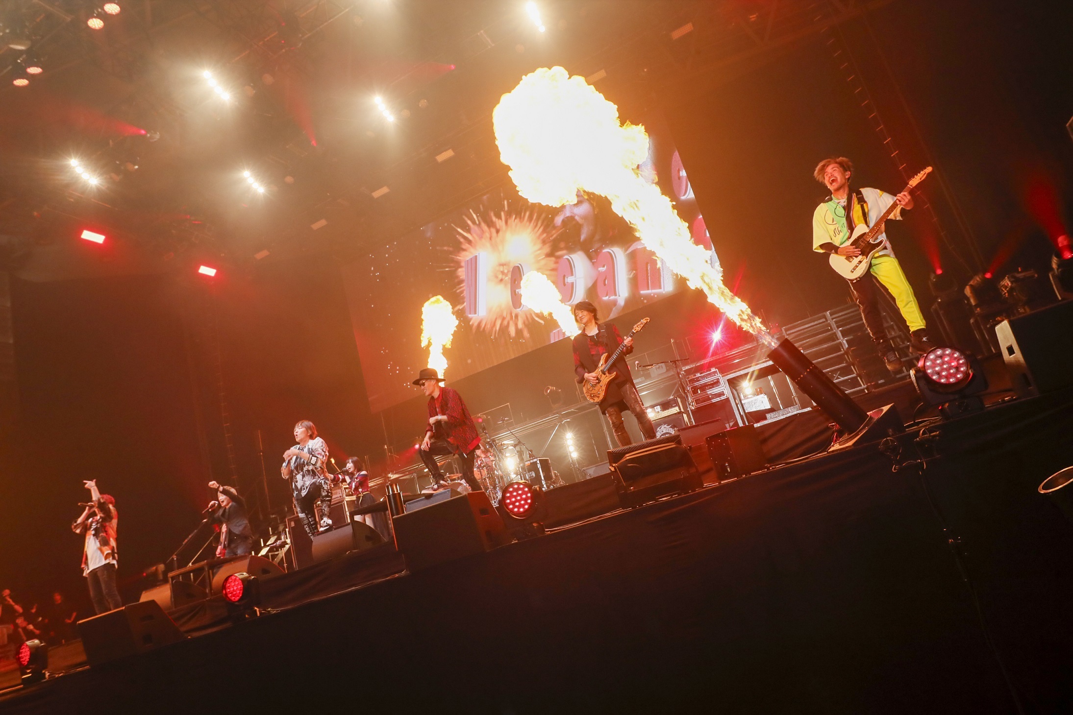 続いて、ゼロ(福山潤)が再びステージに登場すると、ナナリー(名塚佳織)との掛け合いでオーディエンスを湧かせ、「歴史的瞬間をその目に刻み込みこめ! そして今宵を最高に盛り上げるのだ!!」と観客を煽り、FLOW☓ORANGE RANGEをステージに呼び込む。ステージの広さを存分に活かす10人の大所帯で披露した「デイドリーム ビリーヴァー」は、両バンドのメンバーそれぞれが強烈な個性を放ち、どこまでも高みに連れてってくれるような高揚感を生み出していた。「この曲だけで帰らせるわけにいかない」と、ORANGE RANGEの「02」、「ビバ★ロック」のカバーも披露し、とにかく楽しそうに演奏していた2組。大興奮するオーディエンスも笑顔で掛け声を合わせ、拳を突き上げながら、歴史的瞬間をその目にしっかり刻み込んでいた。