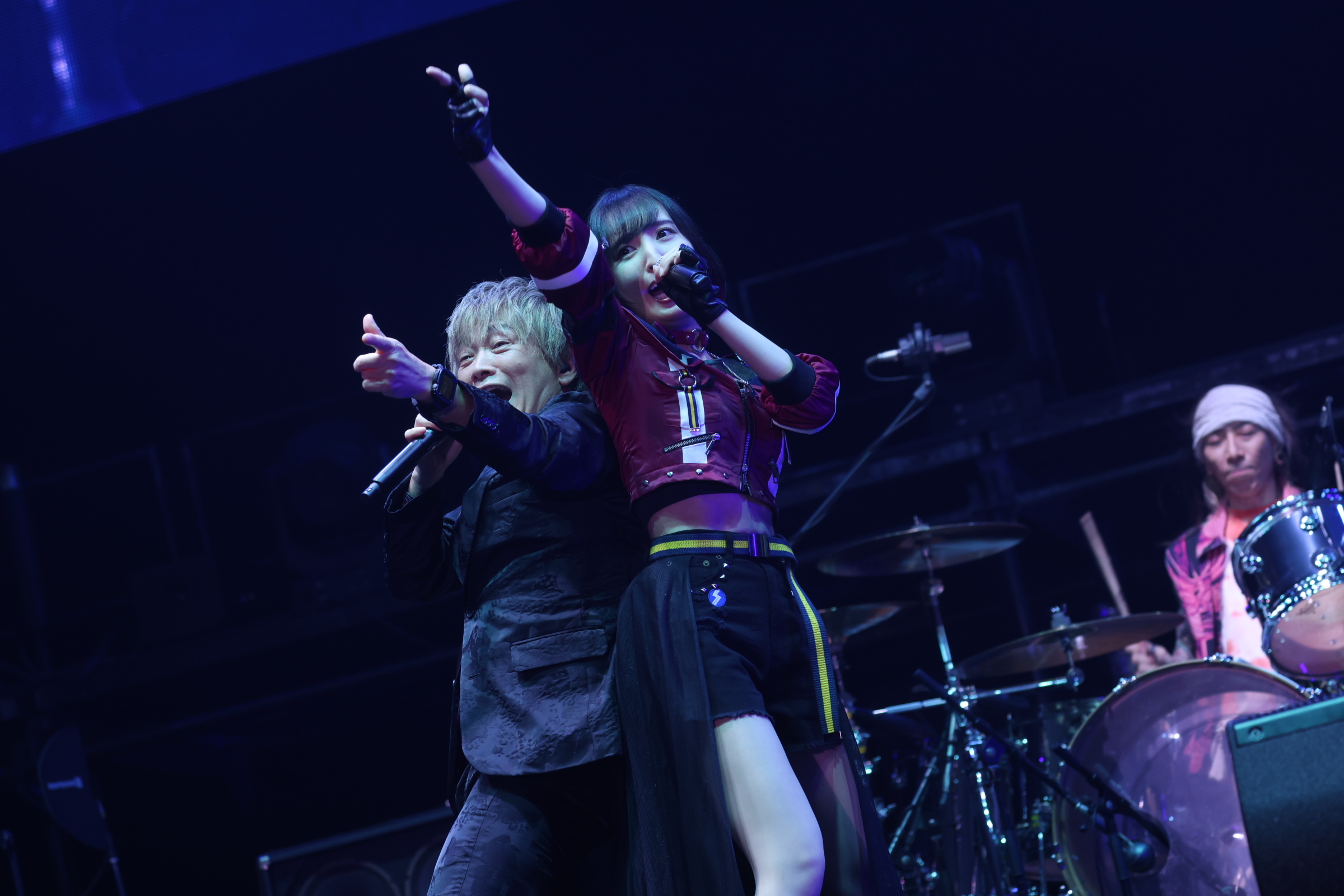 会場を闇が包み、ステージに登場したのは、『コードギアス』のゼロ(福山潤)。不敵な笑いから生セリフでオーディエンスを煽り立てると、「DICE」、「COLORS」とコードギアス楽曲が続く。これらの曲を聴いて改めて思ったのは、FLOWというバンドがコラボするアニメ作品をよく理解してリスペクトして、アニメの世界観を巧みに楽曲に取り入れながらも、自身のスタイルは絶対曲げないという強い意志を持ってるということ。“アニメ縛り”というテーマを掲げたライブかつ、様々な作品のテーマ曲がずらりと並び、たくさんのコラボアーティストが出演したからこそ、より感じたと思うのだが、FLOWのメンバーのみで演奏するこれらの楽曲は他のアーティストが手掛けるアニソンにはない独創性を放っていたし、デビュー20周年目の「COLORS」はいつも以上に力強く美しく、説得力を持って胸に響いた。