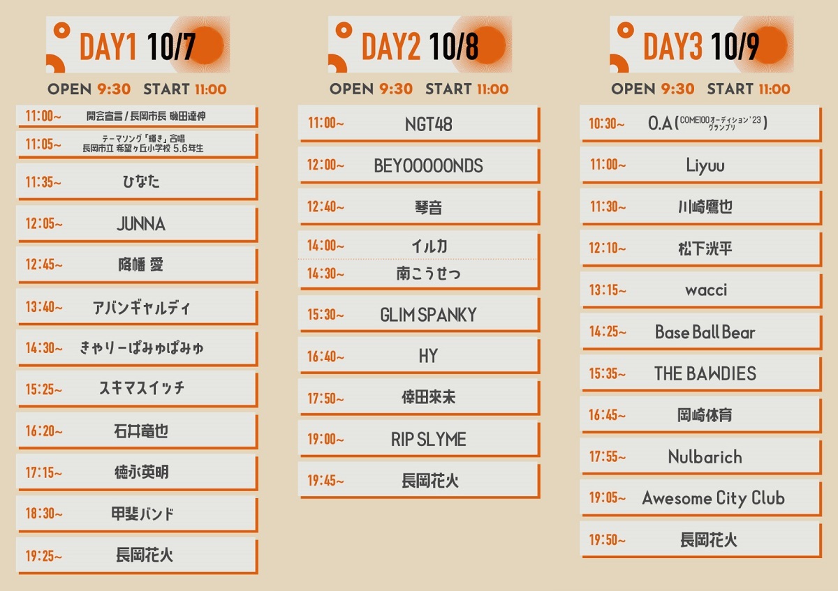 10月7日(土)、8日(日)、9日(月・祝)に新潟県長岡市で開催する『長岡 米百俵フェス ~花火と食と音楽と~ 2023』(通称・米フェス)の最終追加出演アーティストとタイムテーブルが発表された。