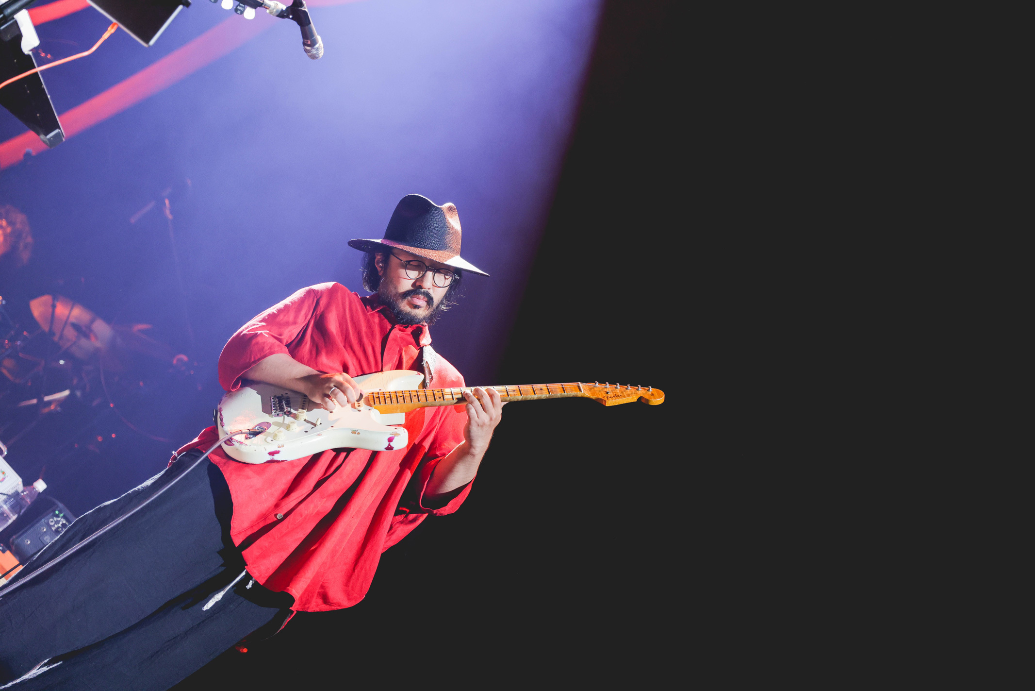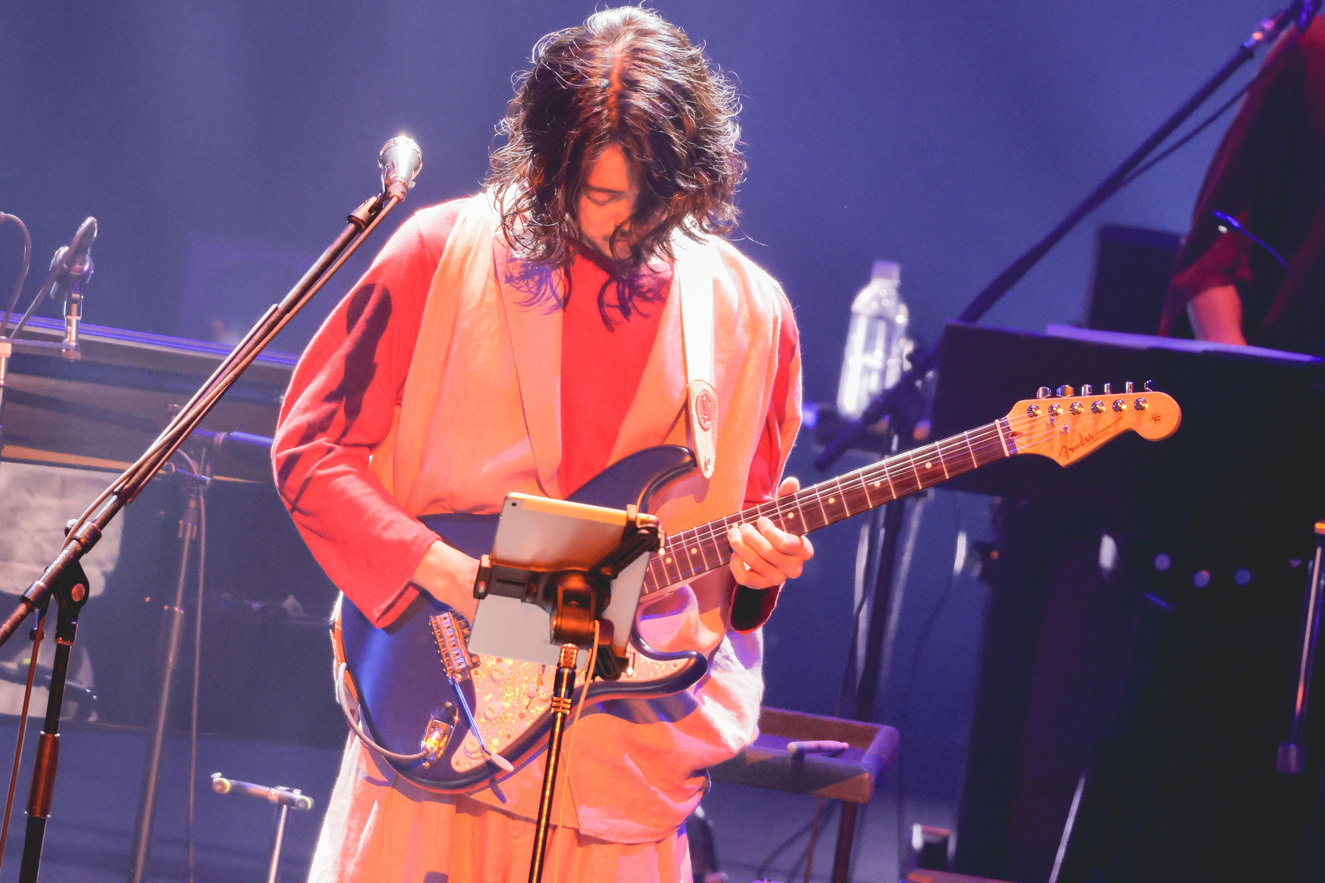 バンドがダンサブルなリズムを奏で始めると、客席に立席を促すように両手で合図をしながら大橋トリオが登場。ギターを抱えた彼が歌い始めたのは、大橋が劇伴をてがけたNHKドラマ『探偵ロマンス』の主題歌「生きる者」。冒頭からの大盤振る舞いに、客席はすでに総立ち状態だ。
