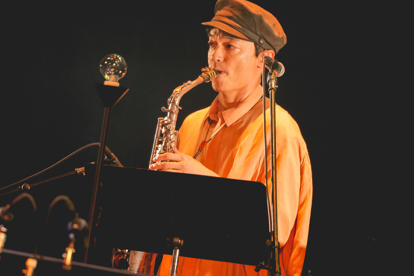 「探偵もので、しかも大正時代。これだけで音楽を作る者としてはゾクゾクするシチュエーションなんですよ。力を入れて制作しました」。そして、『探偵ロマンス』のサントラからオープニング曲と「叶わぬ夢」をアコースティックで披露。さらにこの日は特別に、手嶋葵をフィーチャーした「真夜中のメリーゴーランド」をMonaとのデュエットで披露。サックスのソロパートでは「もう一声」「からの?」「それはさておき」と、さらなる演奏を要求して煽る楽しそうな大橋。強者音楽家集団だからこそ可能な遊びに、客席から大きな歓声が上がる。