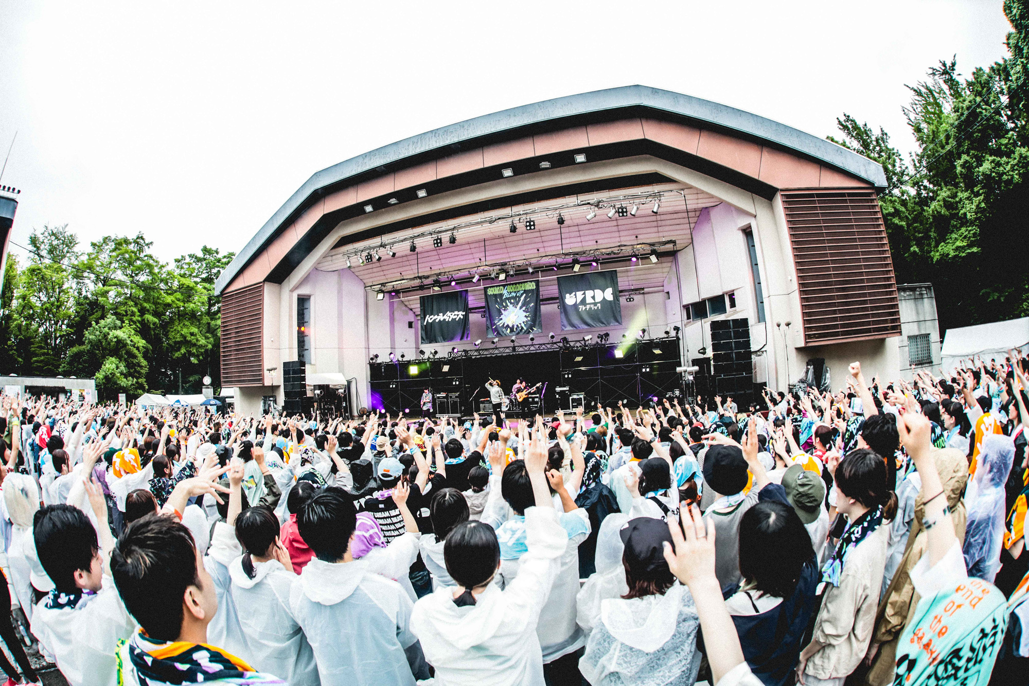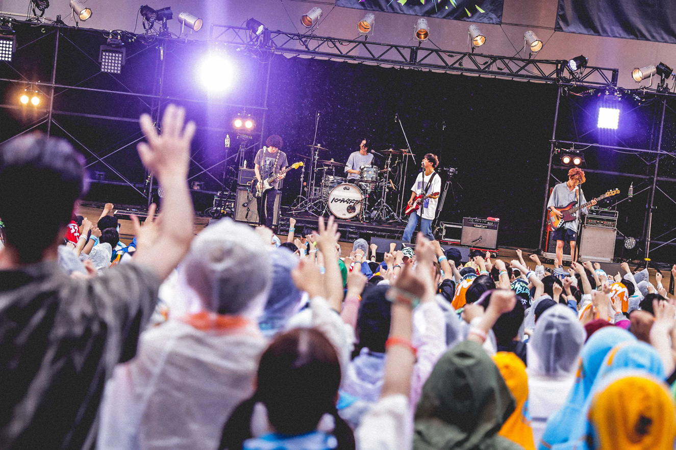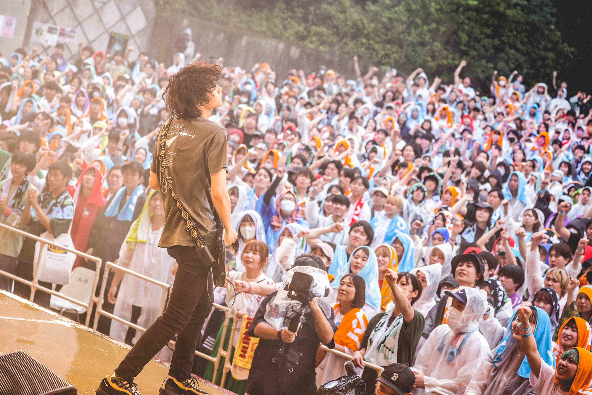 7月1日は朝から雨が降ったり止んだりの天気だった。開場時も雨が降っていたが、会場に集まったオーディエンスはカッパやポンチョを着用してフォトブースで笑顔で写真を撮ったり、グッズを購入していた。その様子からはワクワク感が伝わってくる。それぞれのバンドやイベントオフィシャルのタオルで後ろの芝生席までカラフルに彩られた大阪城野音は高揚感に包まれていた。