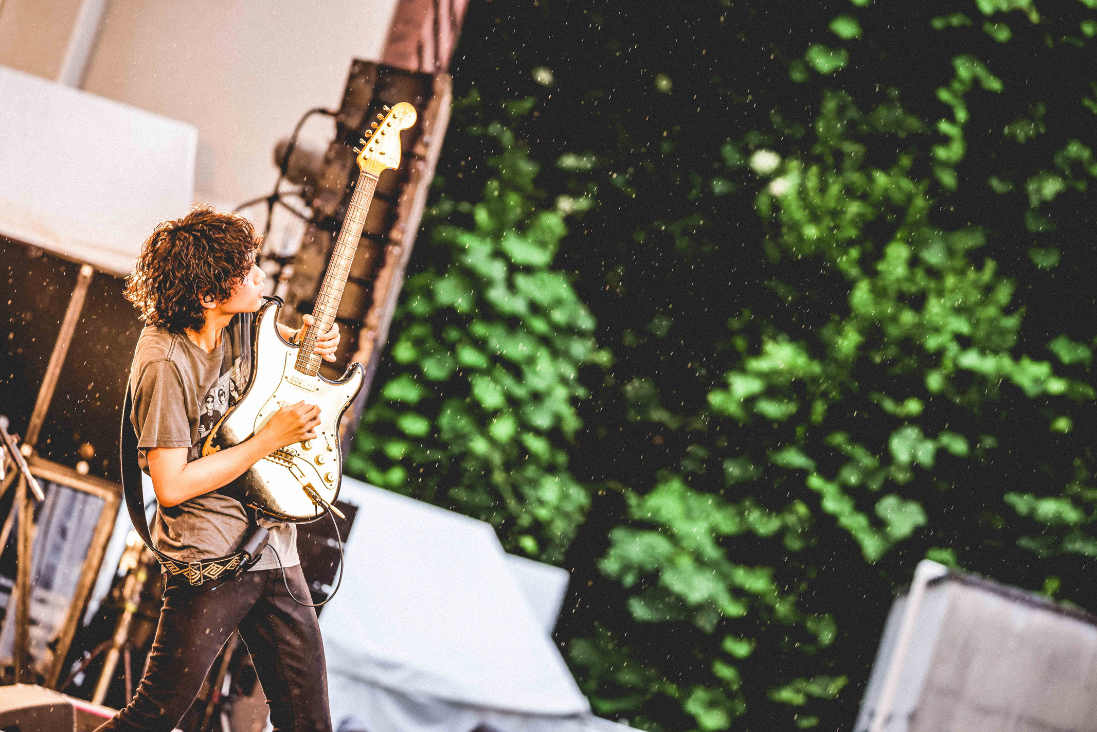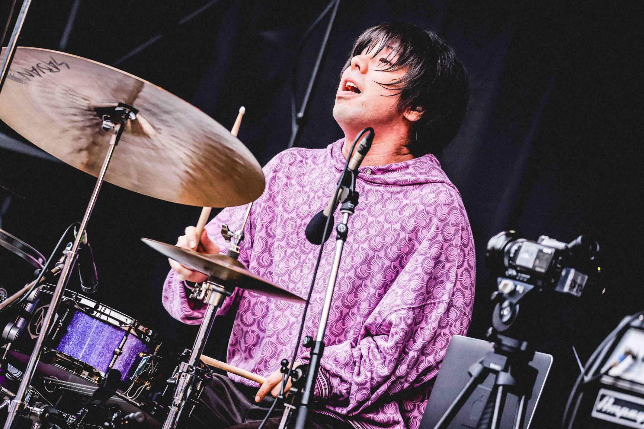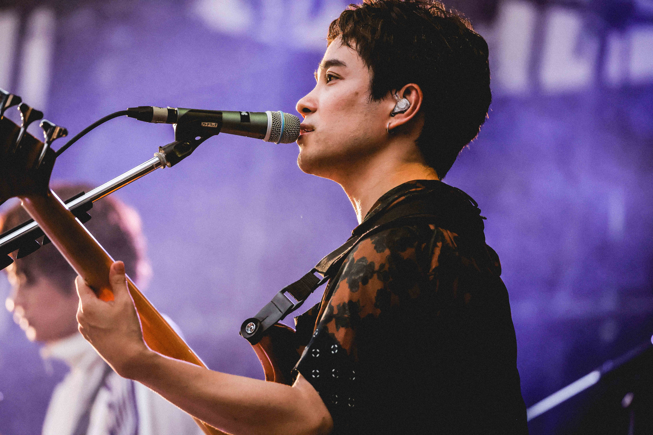 7月1日は朝から雨が降ったり止んだりの天気だった。開場時も雨が降っていたが、会場に集まったオーディエンスはカッパやポンチョを着用してフォトブースで笑顔で写真を撮ったり、グッズを購入していた。その様子からはワクワク感が伝わってくる。それぞれのバンドやイベントオフィシャルのタオルで後ろの芝生席までカラフルに彩られた大阪城野音は高揚感に包まれていた。