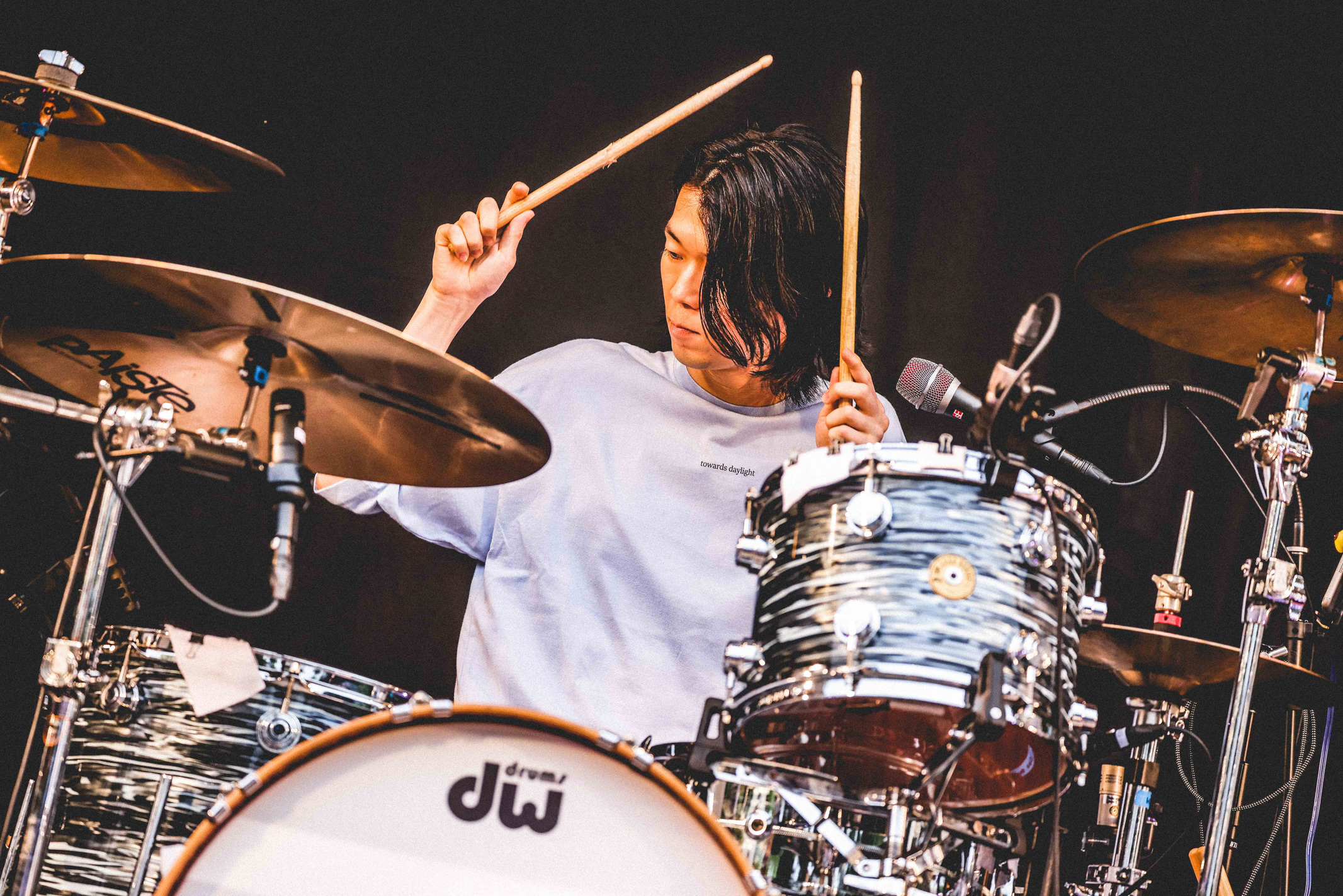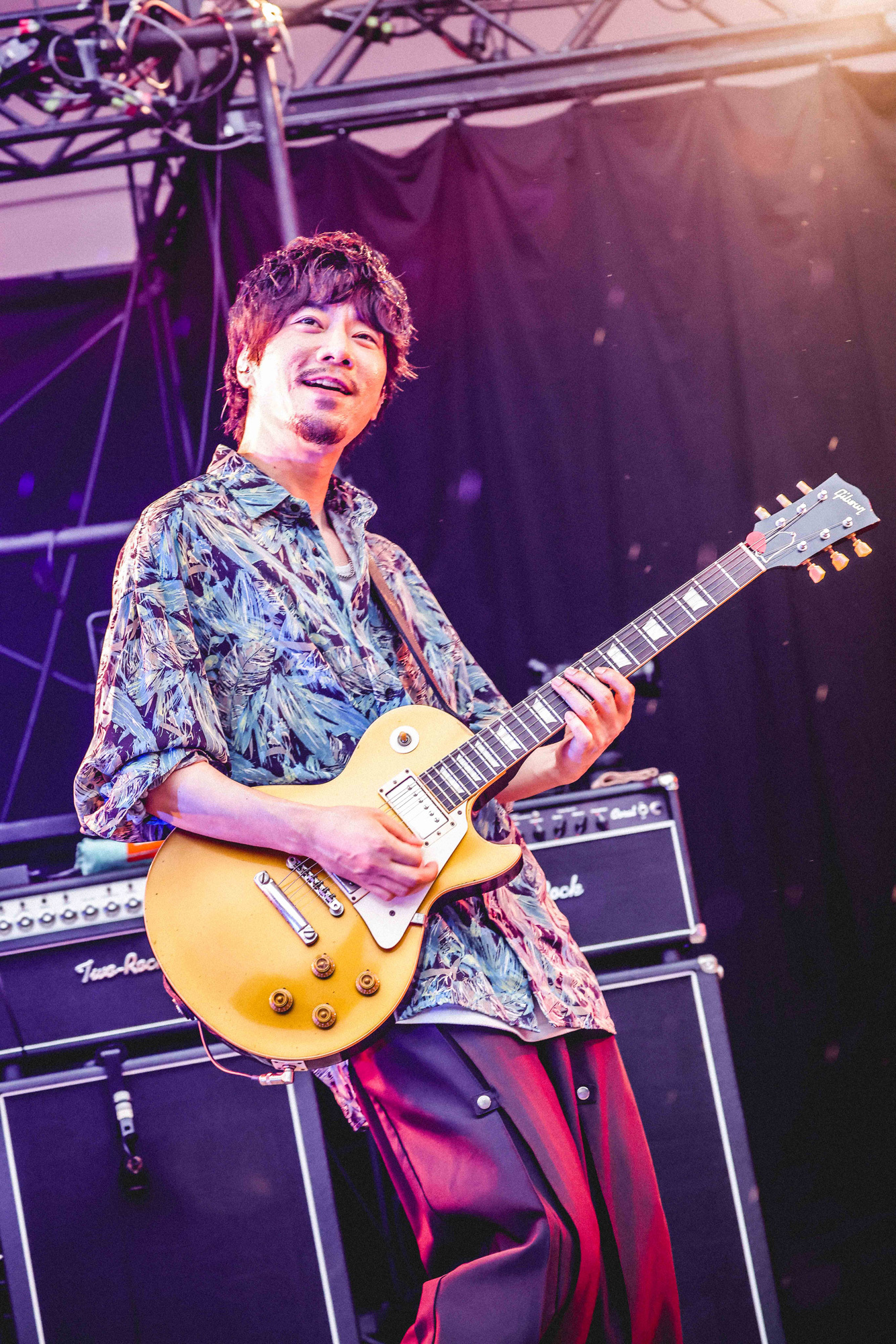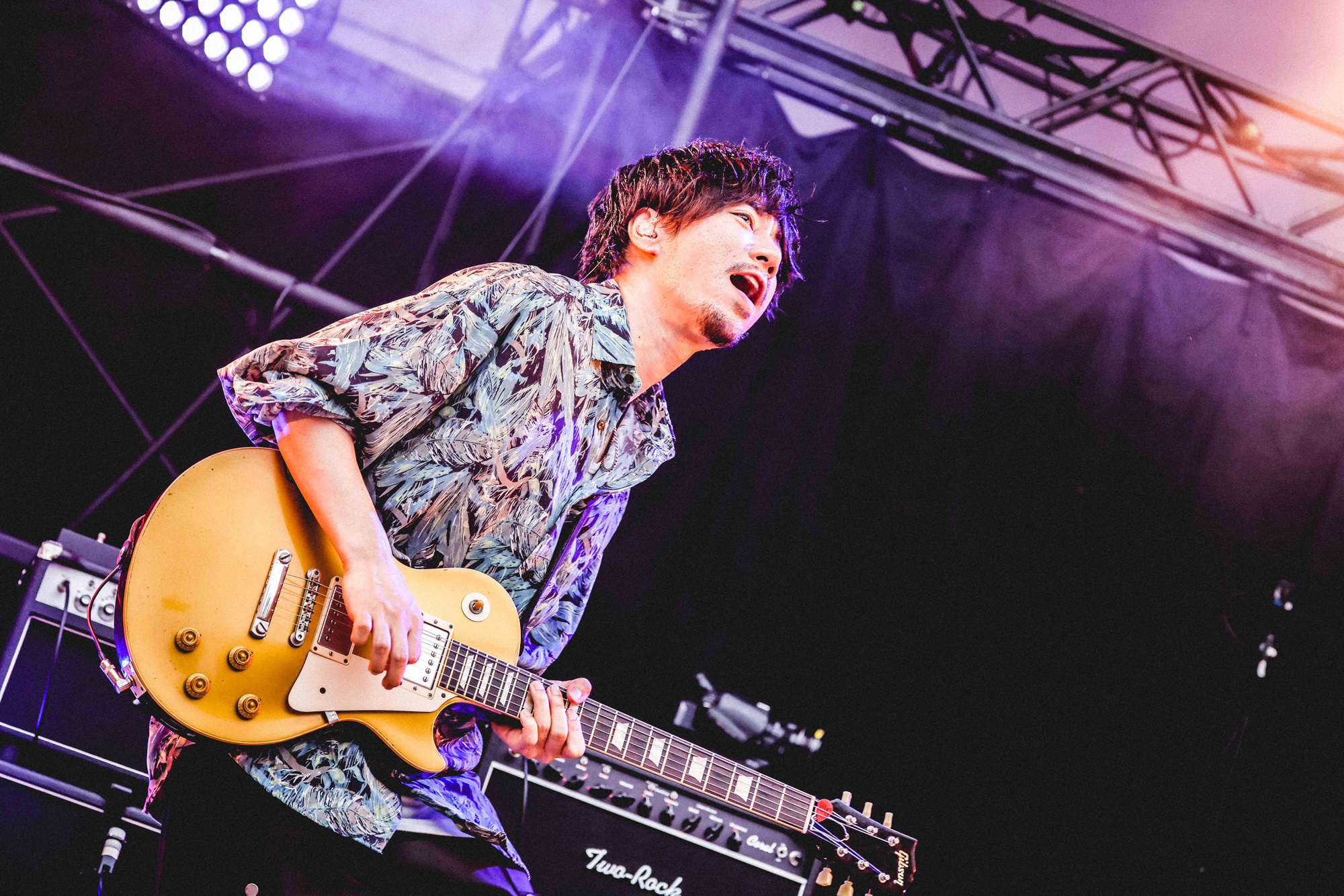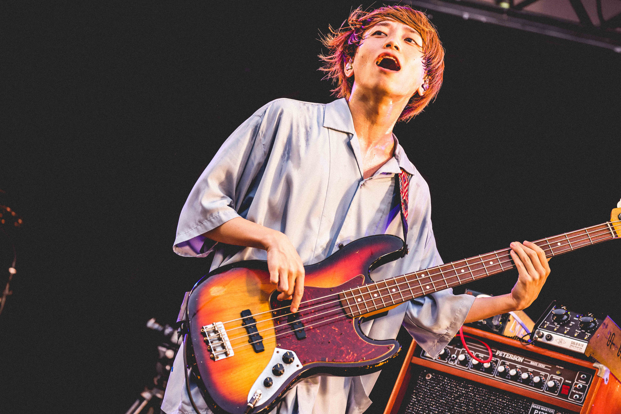 続いて康司のグルーヴィなベースリフが地を這うように響き渡ると「強制はする気ないけど、俺たちの気持ち伝えていい? 踊ってない大阪城野音は気に入らないです!」と「オドループ」を投下。サビでは客席の手が一糸乱れずピッタリ揃う。爽快なまでの盛り上がりに、メンバーも嬉しそうにステージを駆け回る。康司は健司の横に行ってマイクで一緒に歌ったり、歌う健司の後ろに回ってちょんと肩を突いたりとちょっかいを出して楽しそう。赤頭もお立ち台に登り、テクニカルなギターソロをバシッとキメる。高橋は終始笑顔で複雑なボトムのビートを支え続ける。バチバチにカッコ良いパフォーマンスながら、のびのび自由にやっていることがよくわかる。