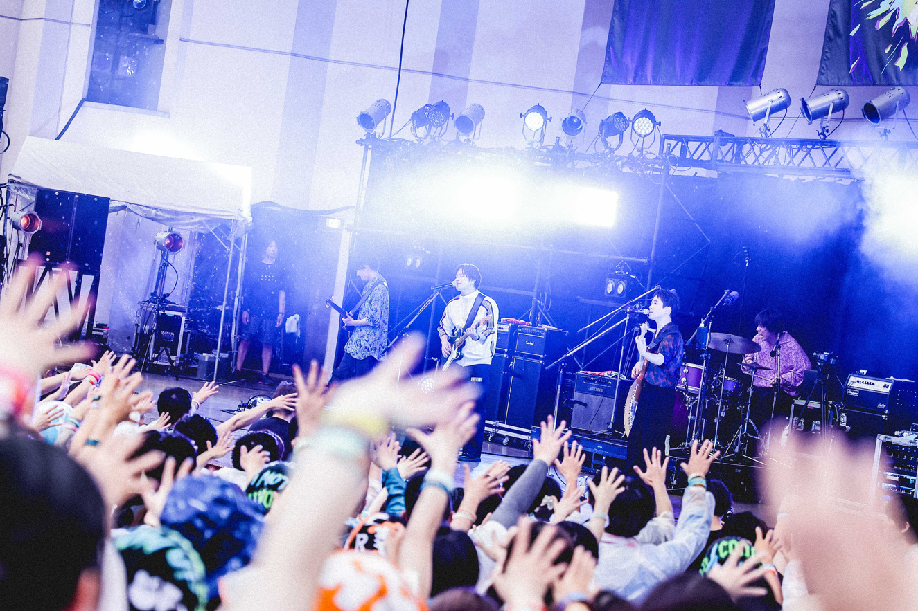 先攻は大阪出身のハンブレッダーズ。SEが流れると客席は総立ちに。ムツムロアキラ(Vo.Gt)、でらし(Ba.Cho)、木島(Dr)、ukicaster(Gt)が登場、でらしは雨の様子をうかがうように空を見上げる。木島の元へ3人が集まり、ジャーン! と音を放つ。1曲目は三原健司(Vo.Gt)が事前インタビューの「お互いのライブで聞きたい曲」で挙げていた「BGMになるなよ」。力強く繰り出されるサウンドに客席は歓喜。メンバーも楽しそうで、のっけからグッドバイブスで一体感を作り出す。