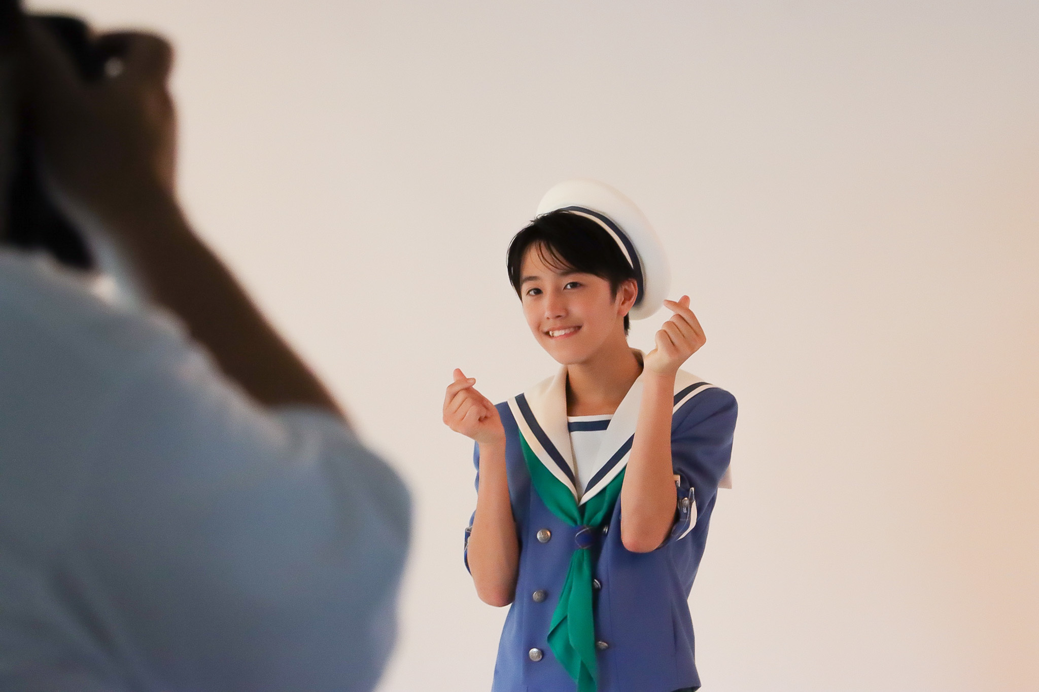 撮影は着々と進行する。船内でバック紙と照明を設置してのカットでは、小道具のヒマワリを持ったり指ハートをしたりと、テンポよく数パターンのポーズをキメてゆく。
