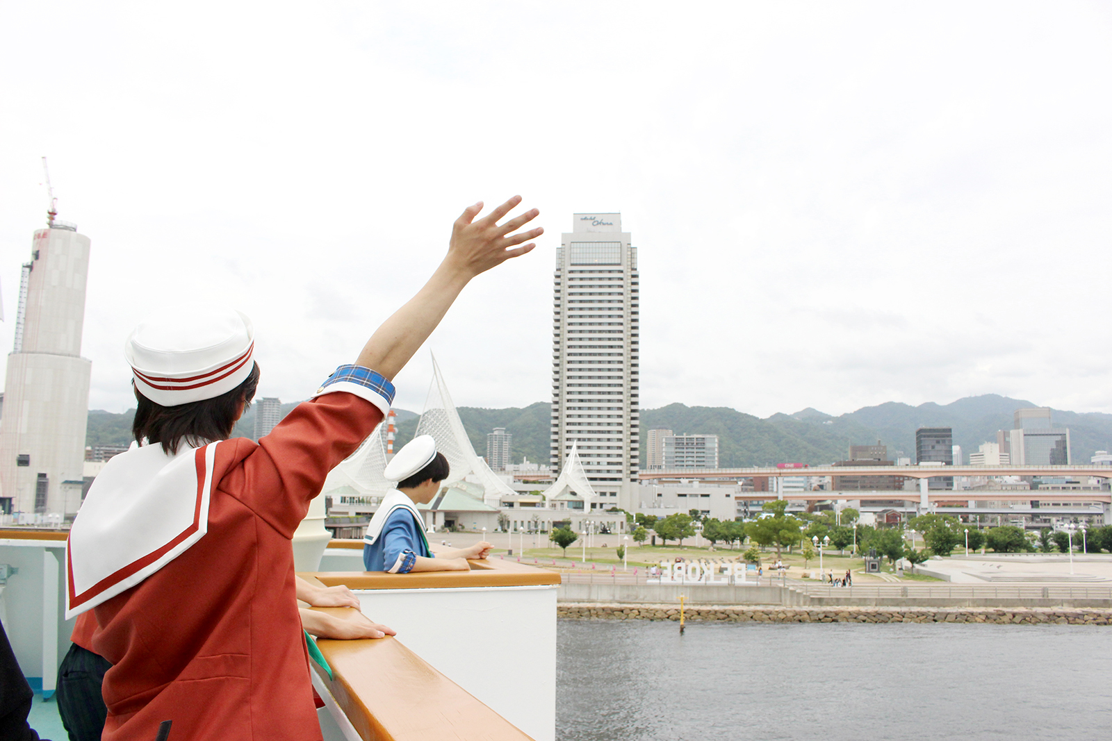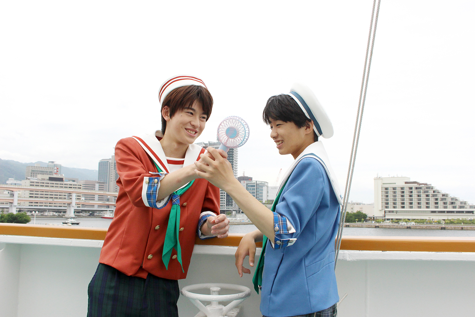 ルミナス神戸2が停泊しているのは、神戸のランドマーク「神戸メリケンパークオリエンタルホテル」の目の前。船のデッキからはメリケンパークが一望できる。まさに「ザ・神戸」という景色が広がる最高のロケーション。神戸セーラーボーイズにピッタリの場所で、船を丸ごと借りての撮影となった。