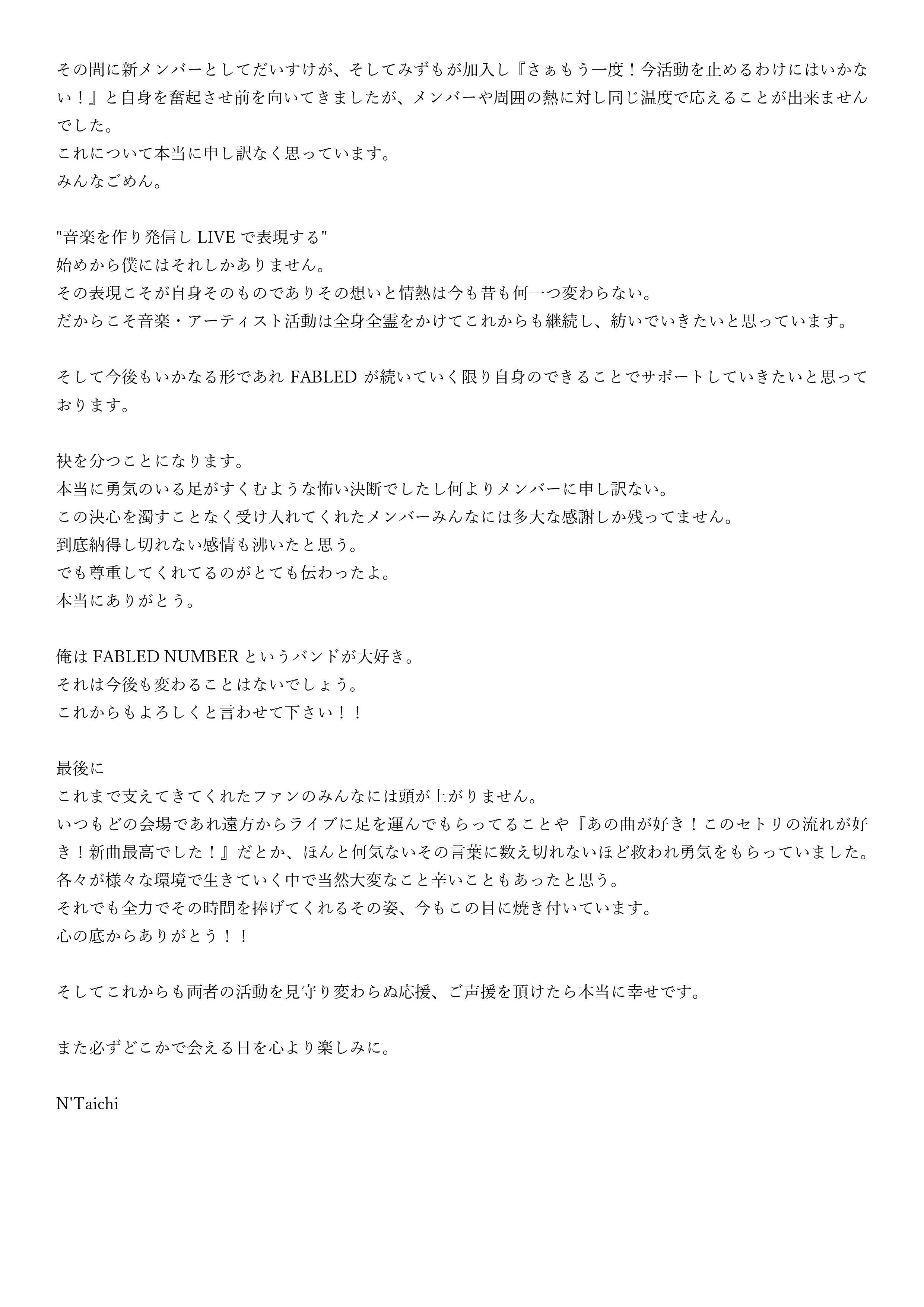 7月18日(火)、FABLED NUMBERからN'Taichiと宗光-Rodriguezの二人が脱退することがわかった。
