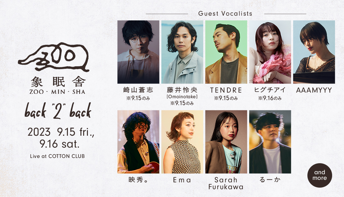 今回ゲストボーカルとして参加するのは、崎山蒼志、藤井怜央(Omoinotake)、TENDRE、ヒグチアイ、AAAMYYY、映秀。、Ema、Sarah Furukawa、るーから。また、象眠舎は、これまでの楽曲に加え、新たなアレンジも初披露するとのこと。