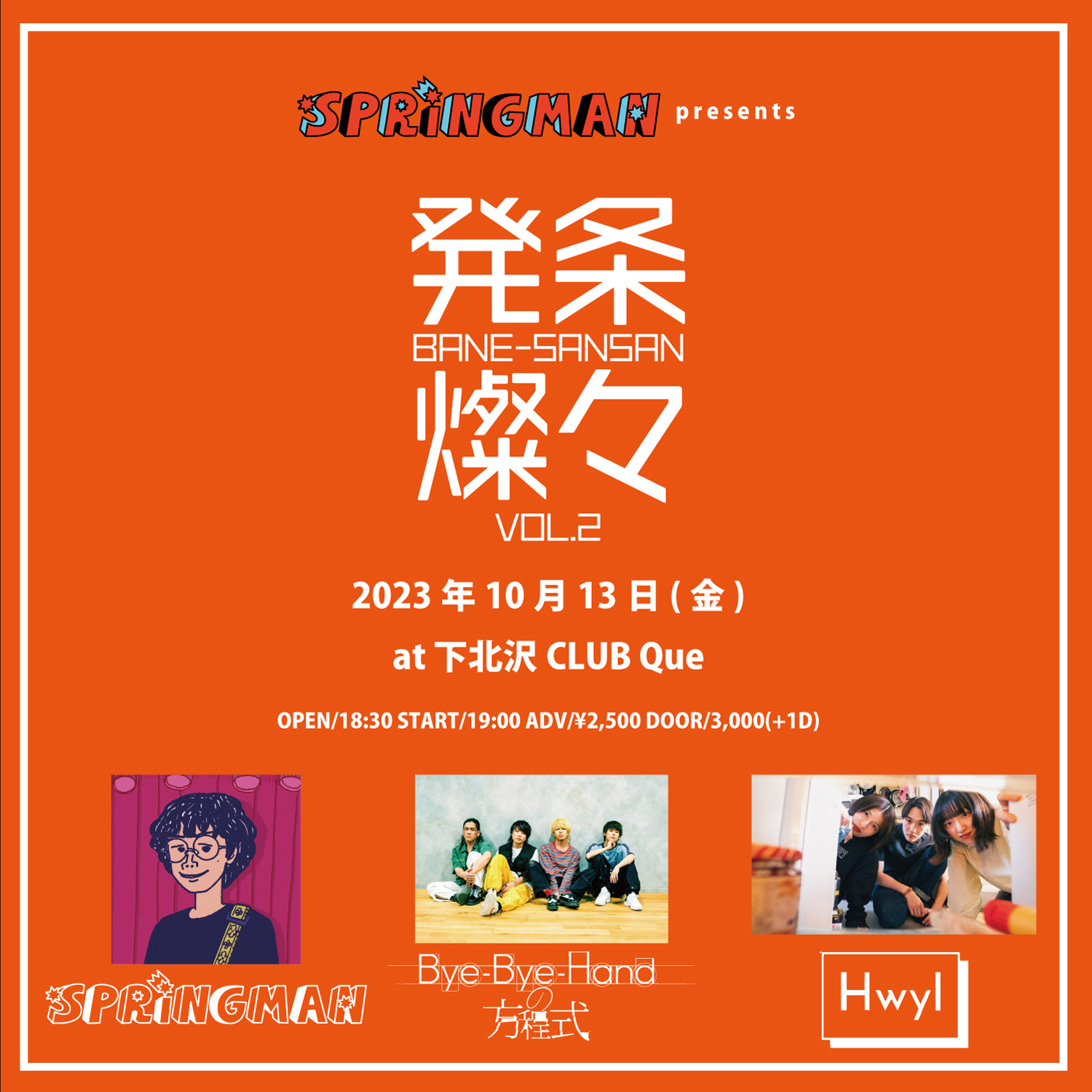 さらに、10月13日(金)に下北沢CLUB Queにて開催される自主企画ライブ『発条燦々vol.2』のゲストも発表。2回目の開催となる今回は、HwylとBye-Bye-Handの方程式を迎えて行われる。
