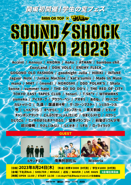 『SOUND SHOCK TOKYO』は、2009年に大阪でスタートした『SOUND SHOCK』の東京編として初開催される、学生バンドの夏フェス。下北沢ReG、SHELTER、MOSAiC、近松、WAVER、LIVE HAUSの6会場を自由に往来できる。