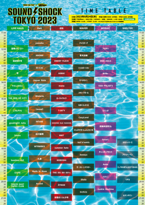 『SOUND SHOCK TOKYO』出演アーティスト第三弾として発表されたのは、goodnight Julia、Sonne、THE RED OF CITY、国道新4号、雫、しゃんグリら、なまくらメトロ、望春メランコリー、前髪ぱっつん少年、やさしいみらい、らくがき。今回の発表で、ゲストバンド3組を含む全64組の出演アーティストが明らかに。同時に、当日のタイムテーブルも発表されている。