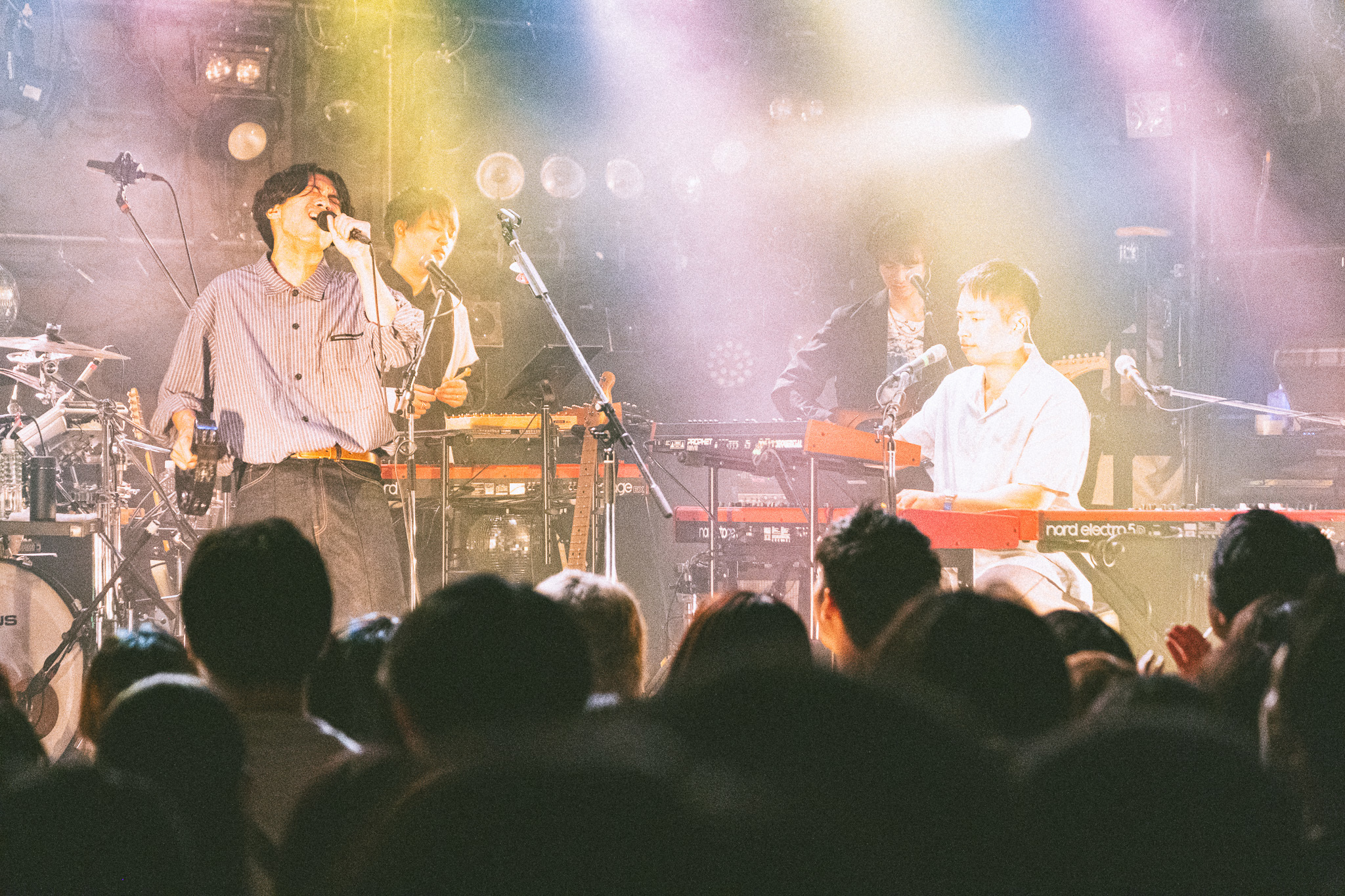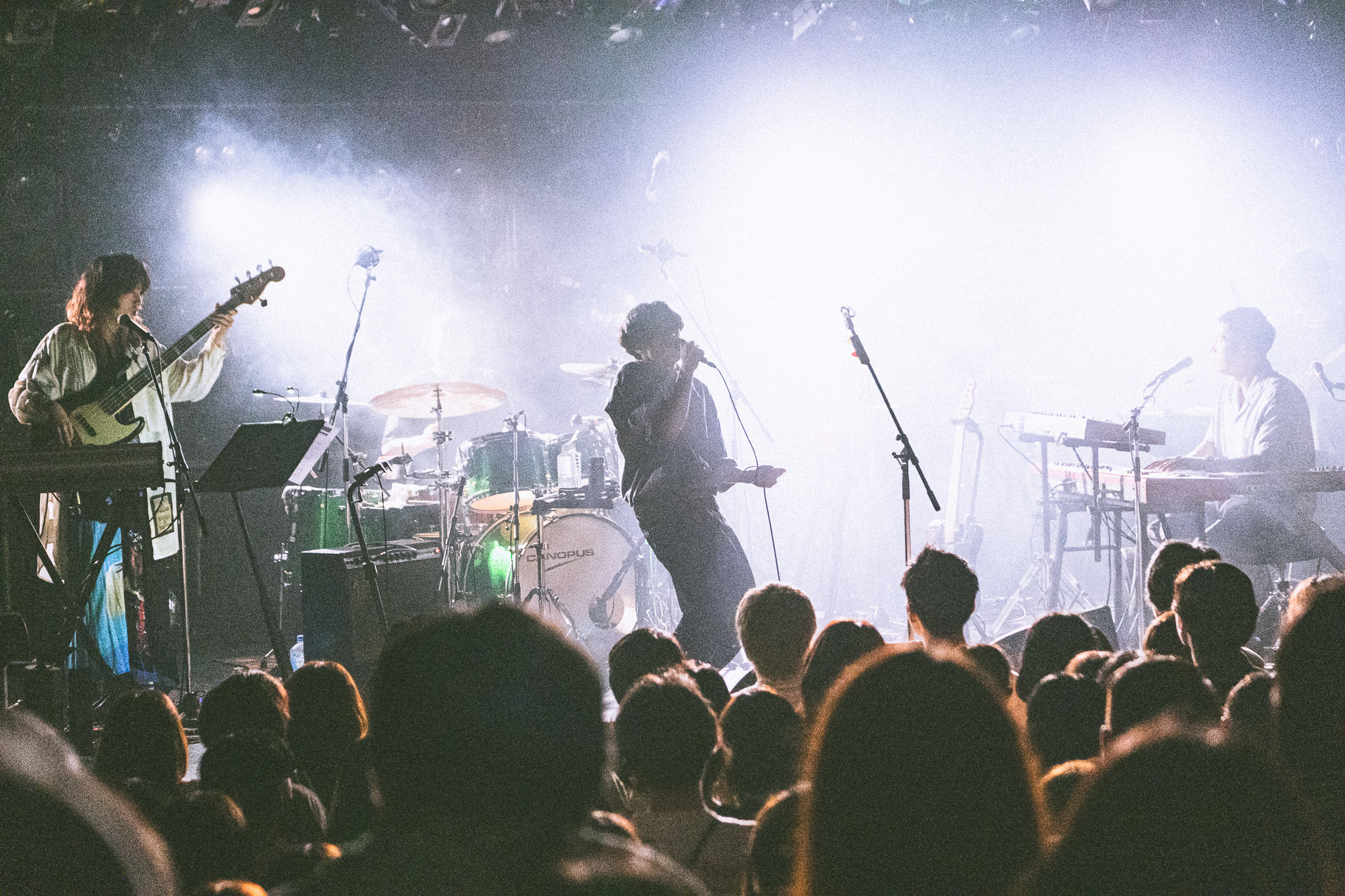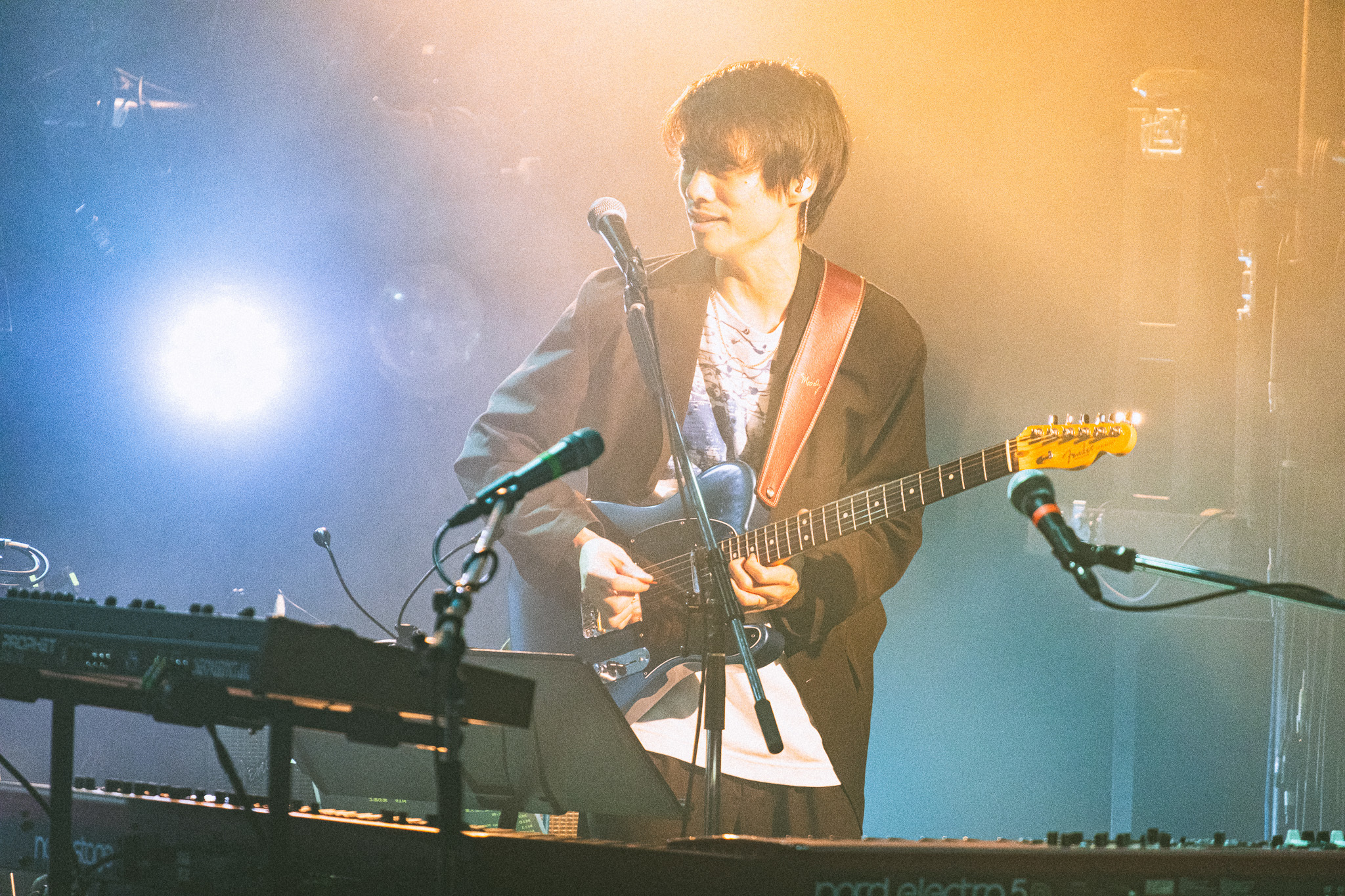 柔らかなイエローの照明がポップな音世界を包み込む中、クラップも自然発生。甫木元がかきむしるアコギがレイドバックなムードを醸し出し、一転しての「Over Now」では朝田拓馬(Gt)の泣きのギターや菊池の軽やかな旋律と、丁寧に重ねられていく音のレイヤーでじわじわと昇り詰めていく。めいっぱい放出されるカタルシスは、今宵のハイライトとなった。