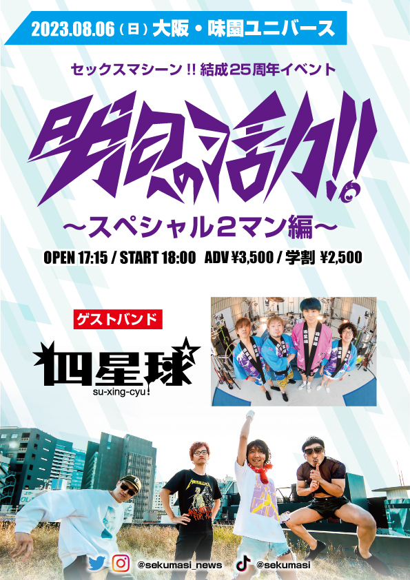 ーーセックスマシーン!!(以下、セクマシ)結成25周年ベントとして、8月6日(日)に味園ユニバースで、約20年のお付き合いがある四星球とライブを開催することになりましたね。