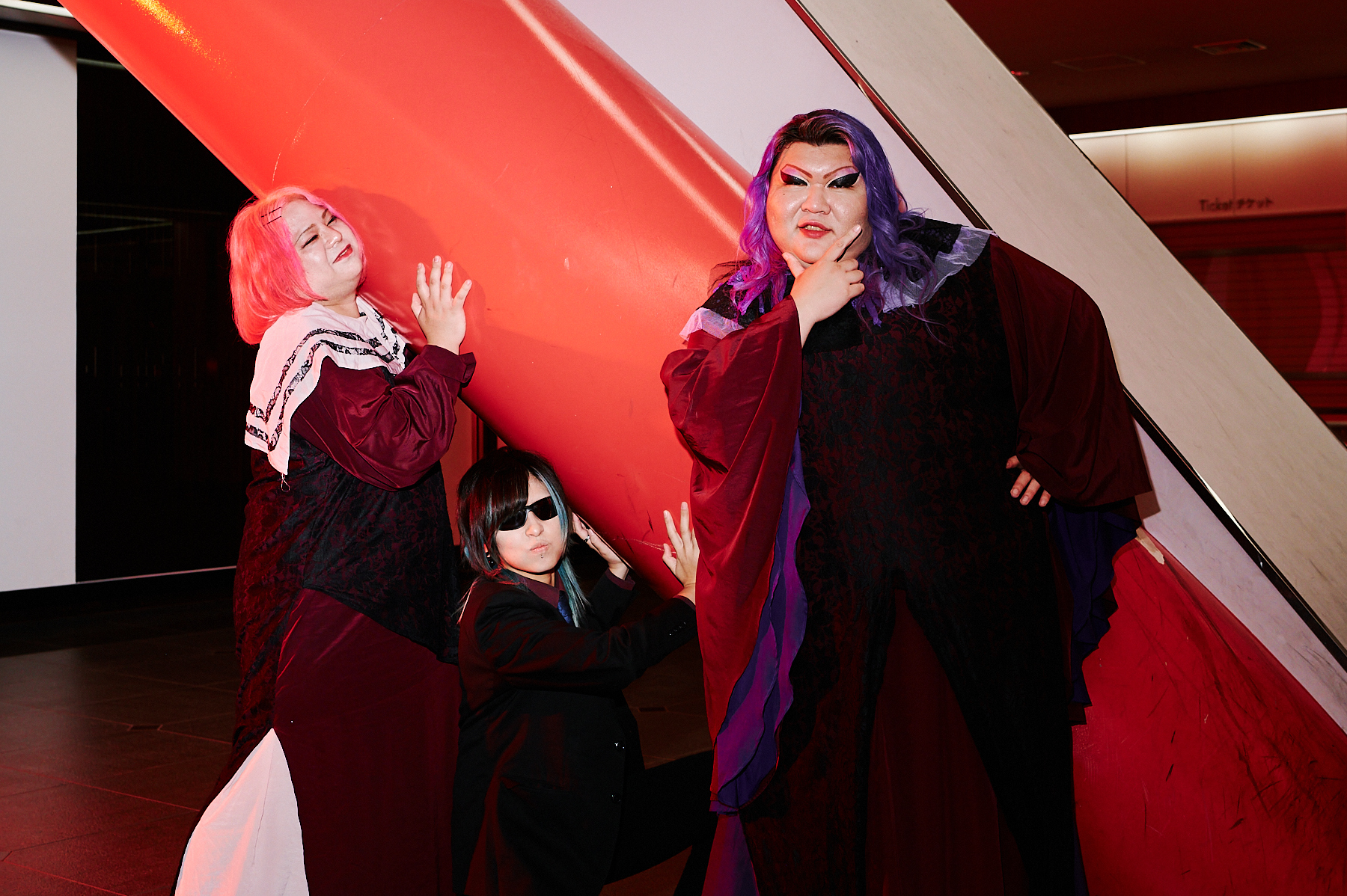 あまりにもゴージャスなメンバーの名前。そして、ずっと見ていると体力がごっそり持っていかれそうになるアーティスト写真。しかもファンの名称は「カロリー」。そんな情報過多な7人組のバンド、デラックス×デラックスが6月2日に1stフルアルバム『千紫万紅(せんしばんこう)』をリリースした。結成の地・沖縄で頭角をあらわし、2023年2月に上京。「昭和歌謡」をモチーフとした楽曲とバンドの活動スタイルがSNSで話題となり、TikTokのフォロワーは7月の時点で約18万人。その一方で、まだ謎に包まれている部分も数多い。そこで今回は、メンバーの輝夜朝蛾王(カグヤアサガオ/Vo.)、道頓堀桜(ドウトンボリサクラ/Dr.)、虎吼(コク/中央守備(SP、DJ、マニュピレーター))に、同バンドについて話を訊いた。