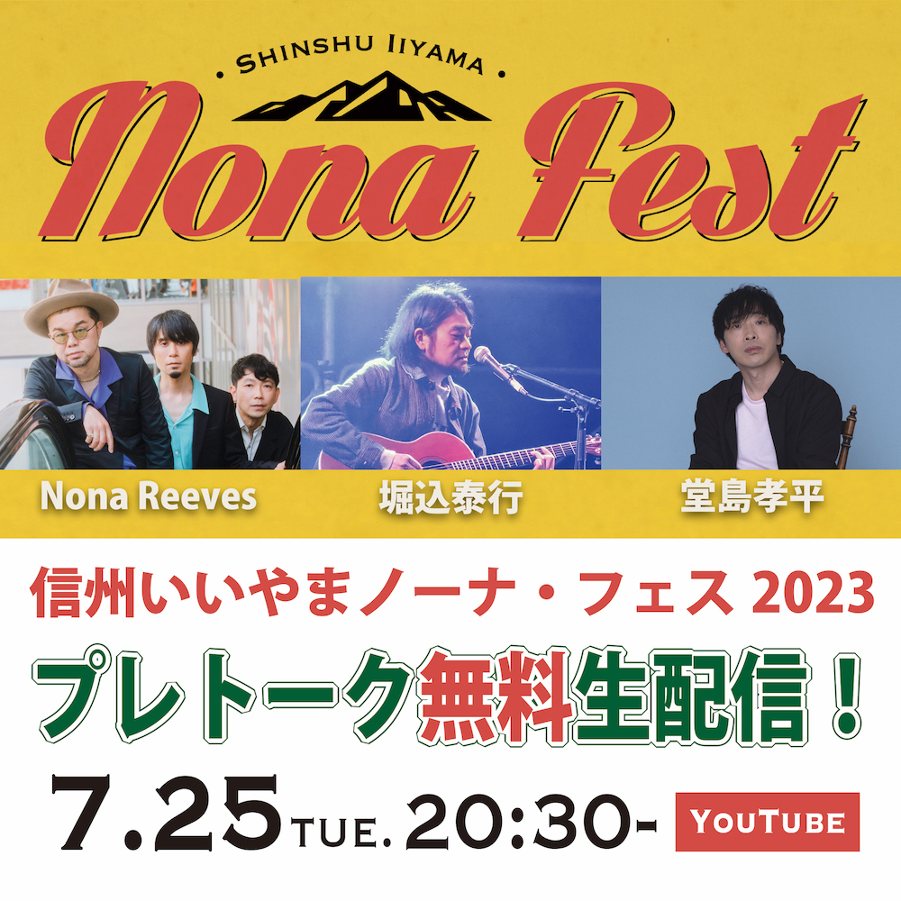 8月5日(土)に⻑野県・飯山市文化交流館なちゅら大ホールで開催される『信州いいやまノーナ・フェス 2023』に出演の3アーティスト(NONA REEVES、堀込泰行、堂島孝平)が集結し、7月25日(火)20:30から無料のプレトーク生配信をすることが決定した。