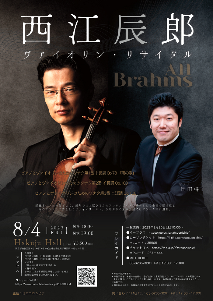 ヴァイオリニストの西江辰郎は、新日本フィルハーモニー交響楽団のコンサートマスターを務めるほかに、久石譲ミュージック・フューチャーのバンドマスター、ジャズ・ピアニストの上原ひろみ ザ・ピアノ・クインテットのメンバーとしてなど、多彩な活動を繰り広げている。そんな彼が、2023年8月4日(金)にHakuju Hallでピアニストの岡田将とともにブラームスのヴァイオリン・ソナタ全曲によるリサイタルをひらく。